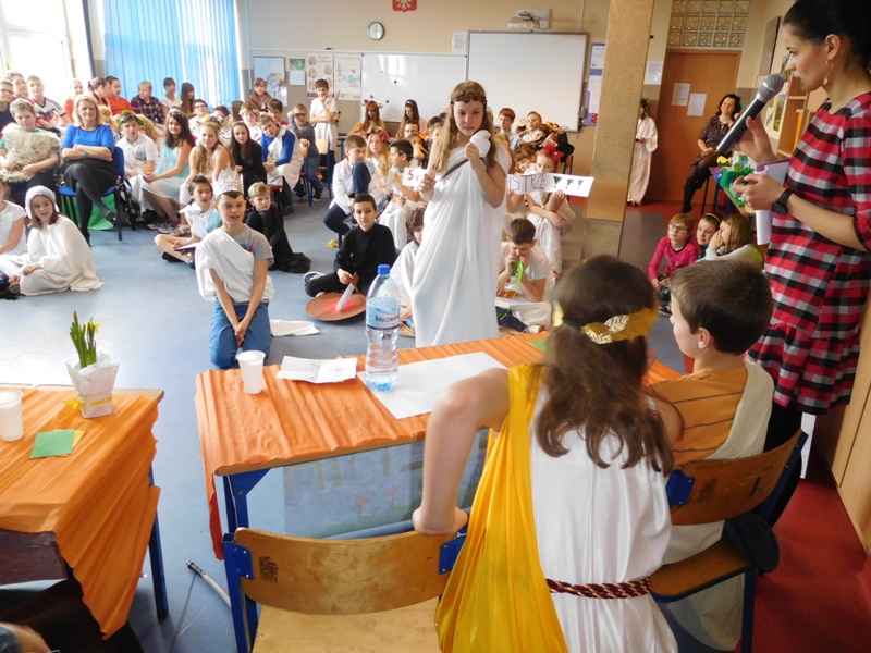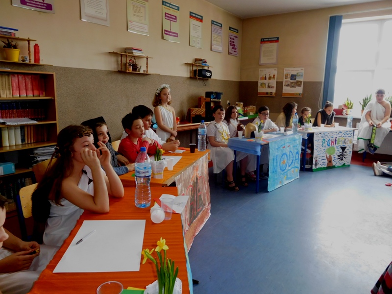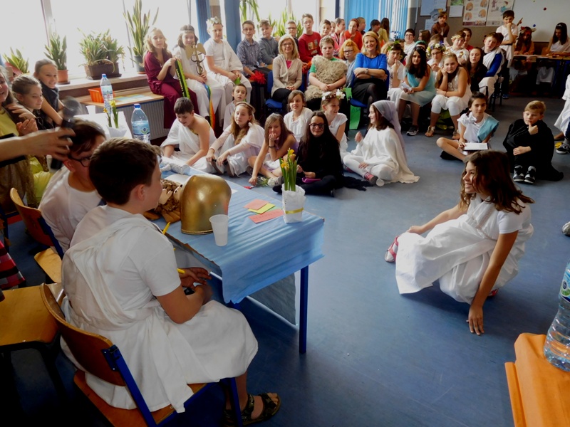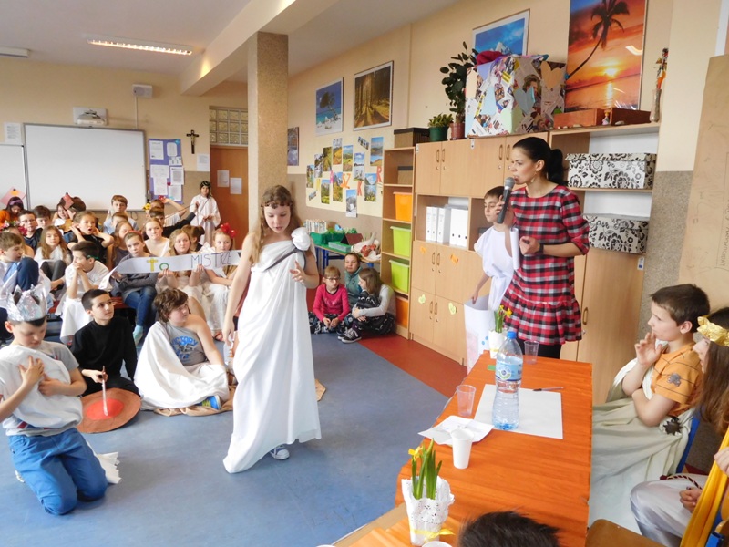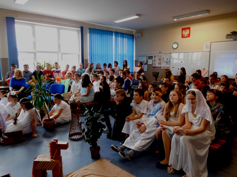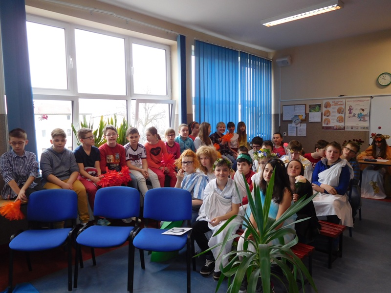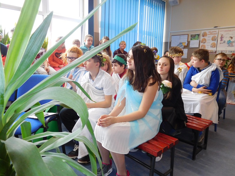 Zwieńczeniem mitologicznego cyklu lekcji były w tym roku szkolnym uczty bogów olimpijskich oraz projekty plastyczne, filmowe. Ponadto wszyscy uczniowie napisali test, który stał się podstawą do wyłonienia klasowych reprezentacji do II etapu konkursu mitologicznego. Dnia 8 marca na korytarzach naszej szkoły pojawili się niezwykli goście. Był Zeus z braćmi, jego żona Hera, Afrodyta, Demeter wraz w Korą, Atena, Ares… słowem, cały olimpijski parnas. A nawet kilku śmiertelników o boskich koneksjach. W ich role wcielili się uczniowie klas V, którzy wzięli udział w niecodziennym pokazie mody, będącym wstępem do wielkiego turnieju mitologicznego. Pokaz poprowadziła Olivia Bortel, która przybrała postać złośliwej Eris, bogini niezgody. Nie szczędziła ona naszym modelkom i modelom uszczypliwych uwag; oto mała próbka jej możliwości: "Ojciec i syn, realista i marzyciel – Dedal i Ikar. Powitajmy Szymona Pawlasa oraz Kamila Gawlika. Oj, Ikarku, dlaczego nie posłuchałeś tatusia? Zawsze urocza, zawsze młoda Hebe. Powiedz lepiej, jaki masz krem na te zmarszczki, Julio Pańczuk". Zebranie mieli również niepowtarzalną okazję usłyszeć powitanie wygłoszone w języku greckim przez Victorię Adamidis z klasy V "d":