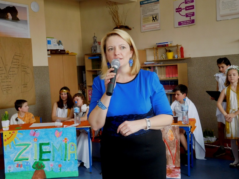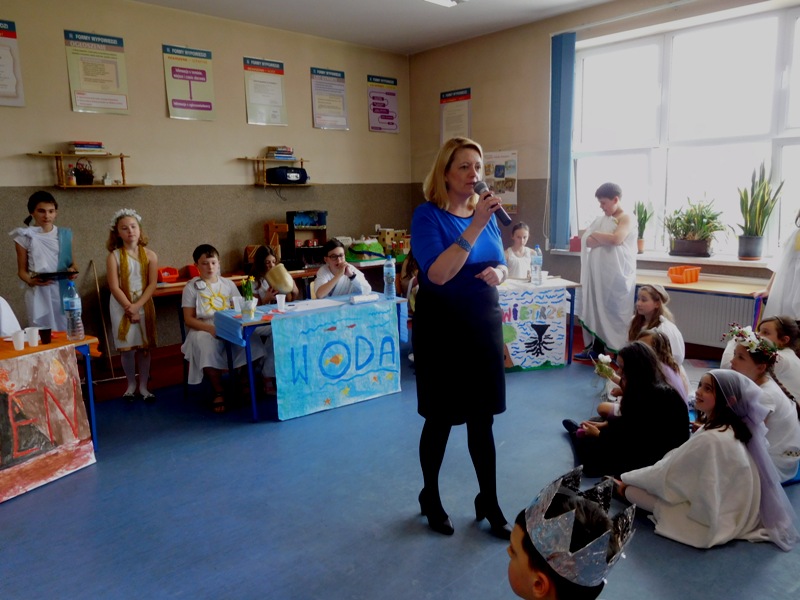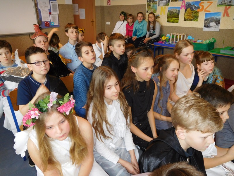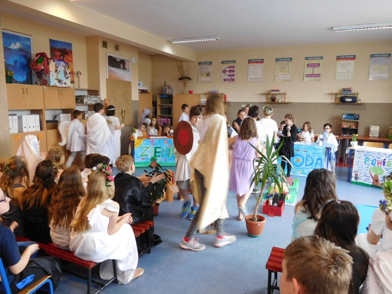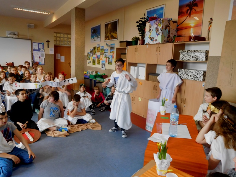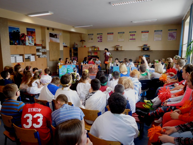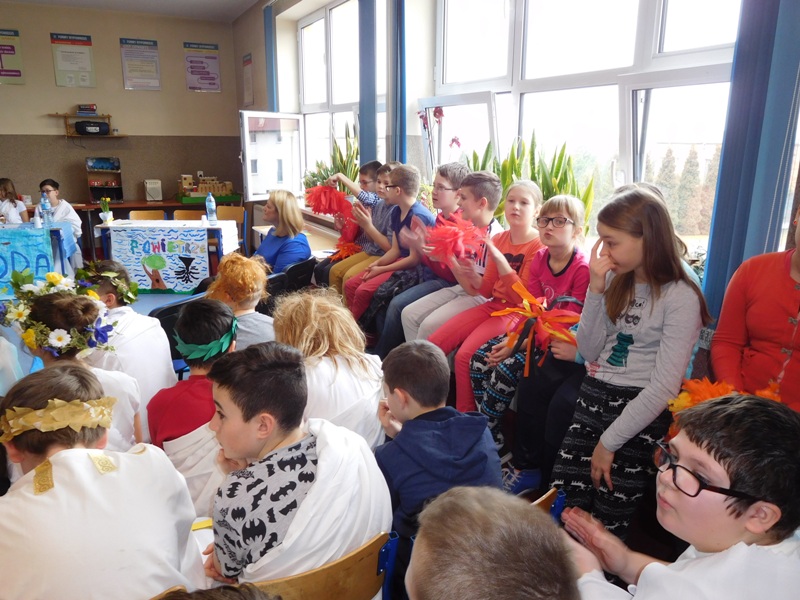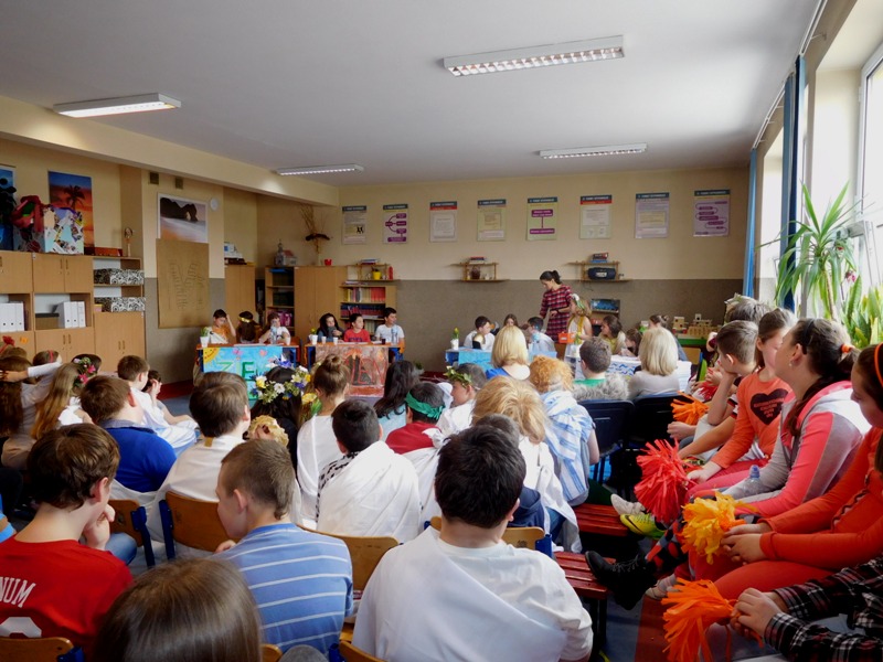 Zwieńczeniem mitologicznego cyklu lekcji były w tym roku szkolnym uczty bogów olimpijskich oraz projekty plastyczne, filmowe. Ponadto wszyscy uczniowie napisali test, który stał się podstawą do wyłonienia klasowych reprezentacji do II etapu konkursu mitologicznego. Dnia 8 marca na korytarzach naszej szkoły pojawili się niezwykli goście. Był Zeus z braćmi, jego żona Hera, Afrodyta, Demeter wraz w Korą, Atena, Ares… słowem, cały olimpijski parnas. A nawet kilku śmiertelników o boskich koneksjach. W ich role wcielili się uczniowie klas V, którzy wzięli udział w niecodziennym pokazie mody, będącym wstępem do wielkiego turnieju mitologicznego. Pokaz poprowadziła Olivia Bortel, która przybrała postać złośliwej Eris, bogini niezgody. Nie szczędziła ona naszym modelkom i modelom uszczypliwych uwag; oto mała próbka jej możliwości: "Ojciec i syn, realista i marzyciel – Dedal i Ikar. Powitajmy Szymona Pawlasa oraz Kamila Gawlika. Oj, Ikarku, dlaczego nie posłuchałeś tatusia? Zawsze urocza, zawsze młoda Hebe. Powiedz lepiej, jaki masz krem na te zmarszczki, Julio Pańczuk". Zebranie mieli również niepowtarzalną okazję usłyszeć powitanie wygłoszone w języku greckim przez Victorię Adamidis z klasy V "d":