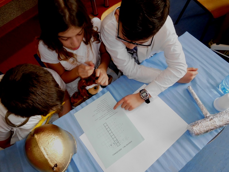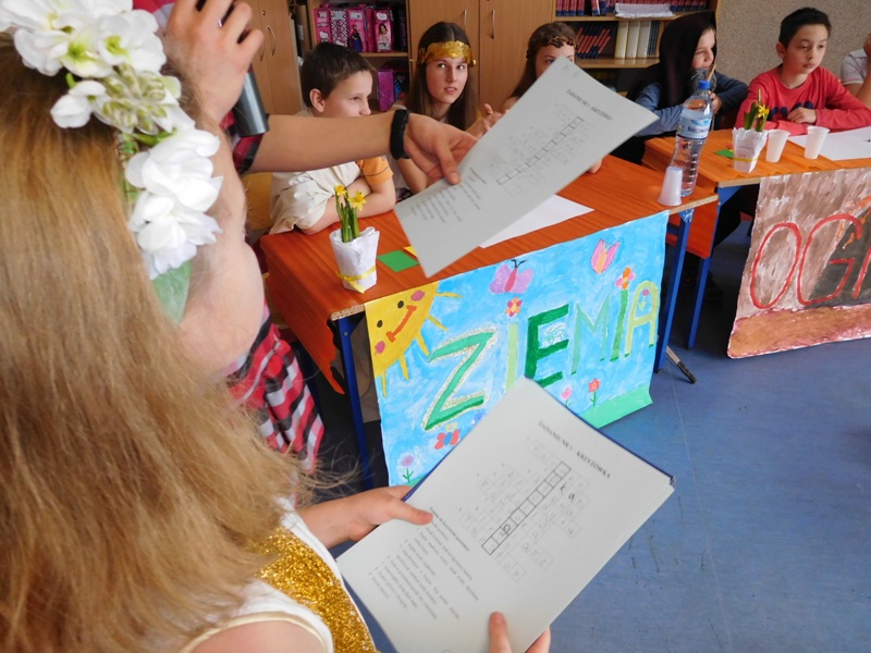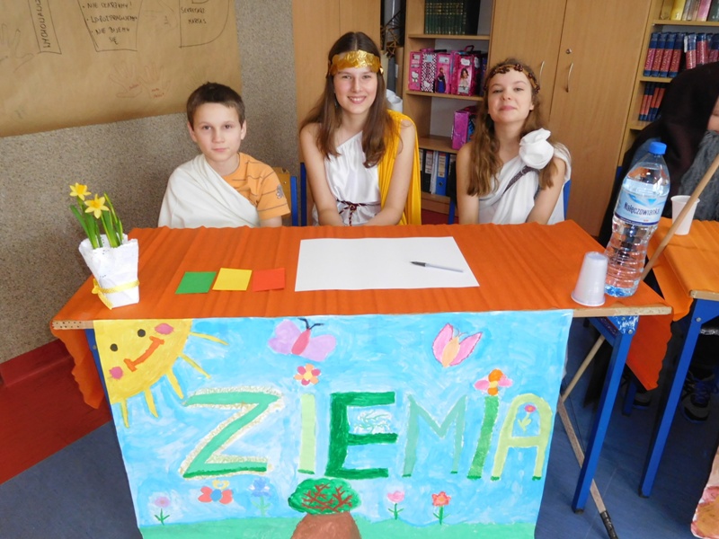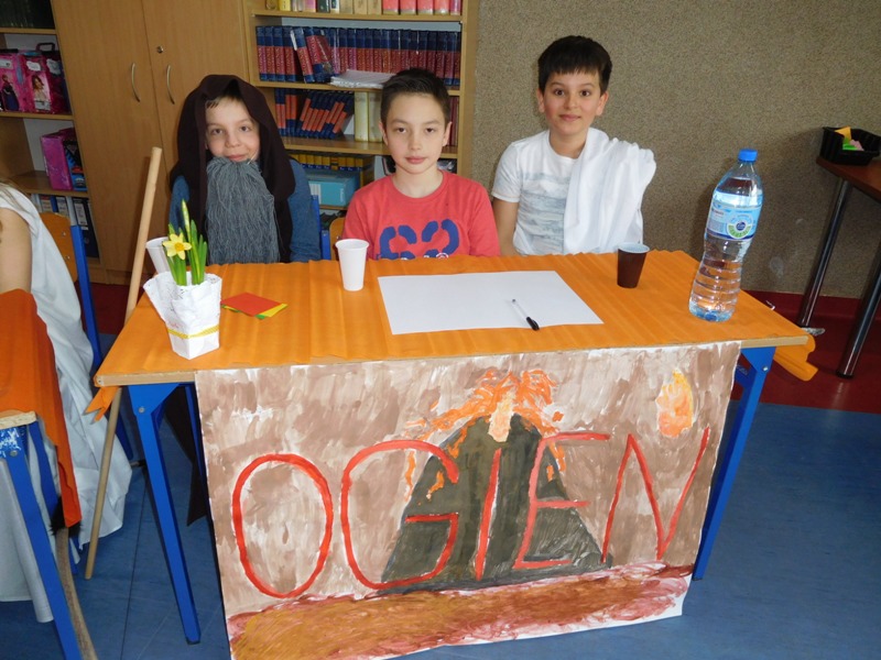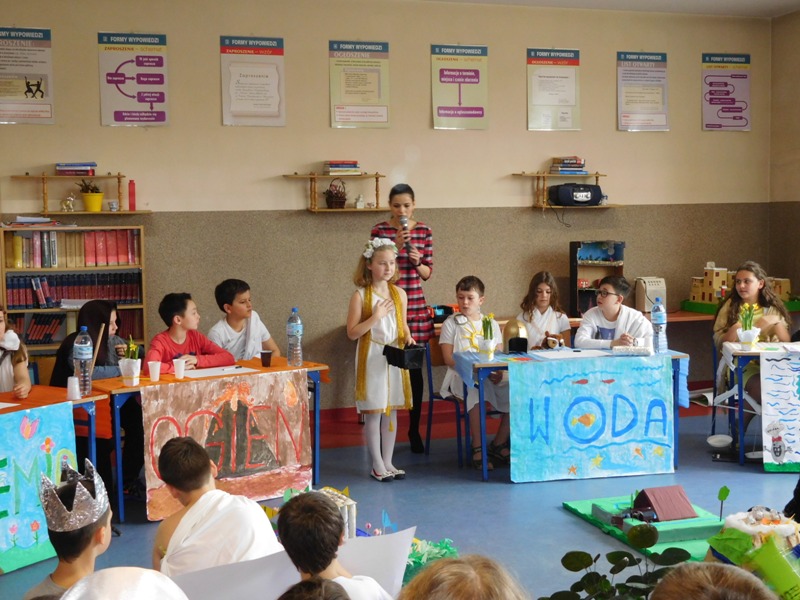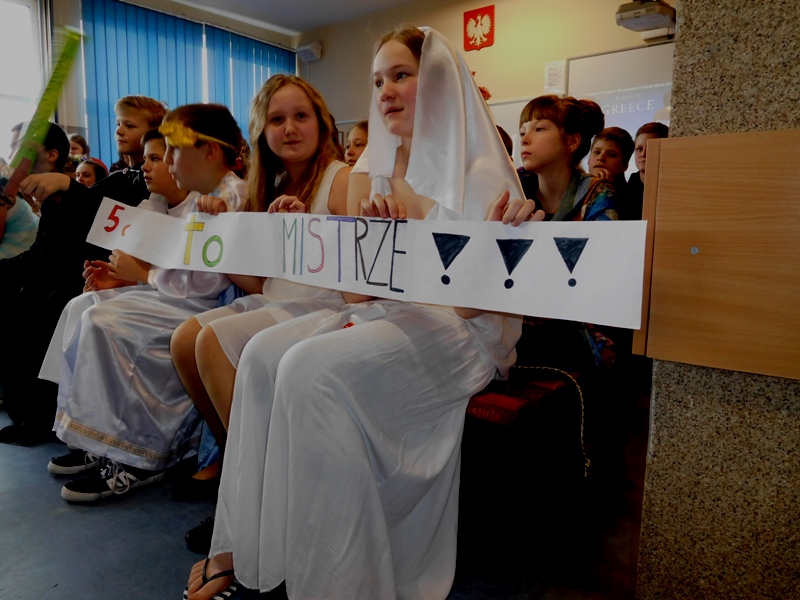 Po tej "rozgrzewce" nastąpił konkurs wiedzy o mitach, w którym aktywny udział brali nie tylko reprezentanci klas, ale wszyscy zgromadzeni w sali uczniowie, życzliwie dopingując swoje drużyny. "Jakiego koloru była krew bogów?", "Ile lat Odys przebywał poza domem?", "Kogo Syzyf zamknął w piwnicy?" - z tymi m.in. pytaniami najlepiej poradzili sobie uczniowie klasy V „d” (żywioł powietrza), którzy zajęli I miejsce. O miejsce II walczyli reprezentanci żywiołów ognia – kl. V „b” i wody – kl. V „c”. Ostatecznie srebro przypadło V „c”, zaś brąz V „b”. Tuż za podium znalazła się V „a” (żywioł ziemi).