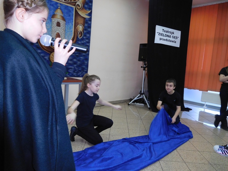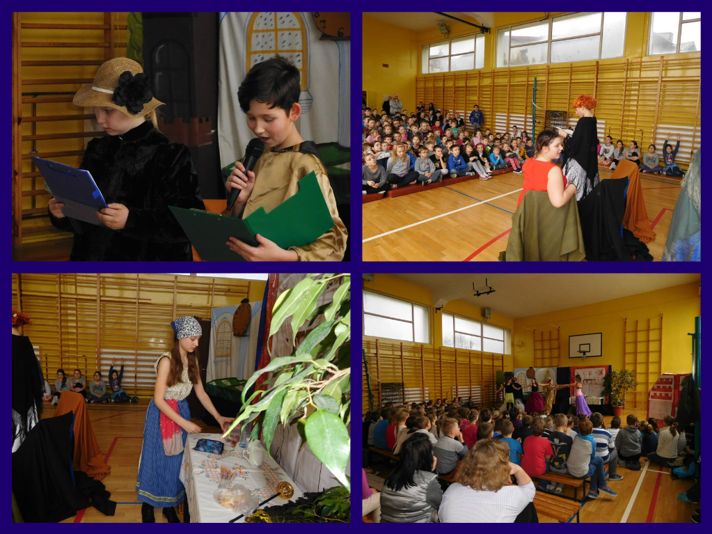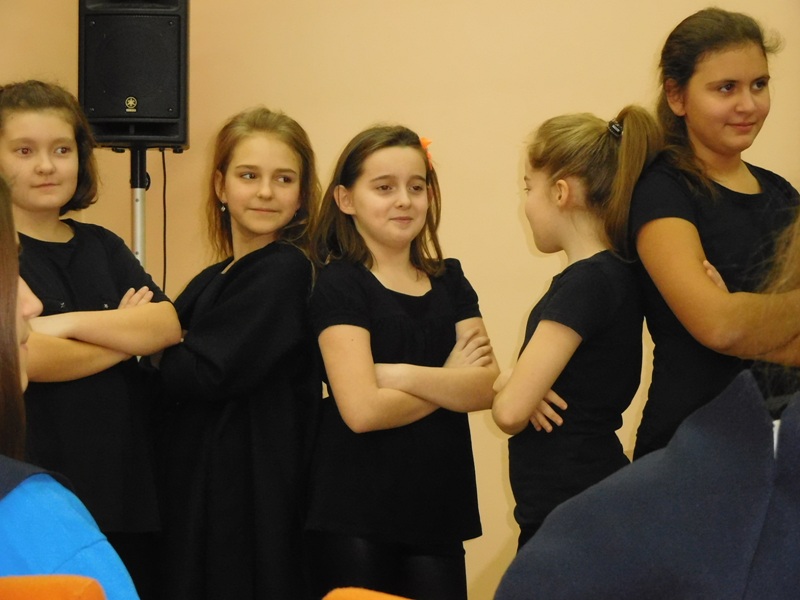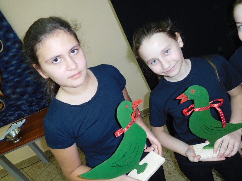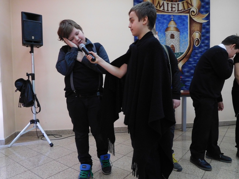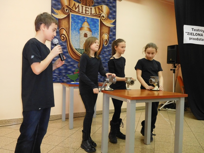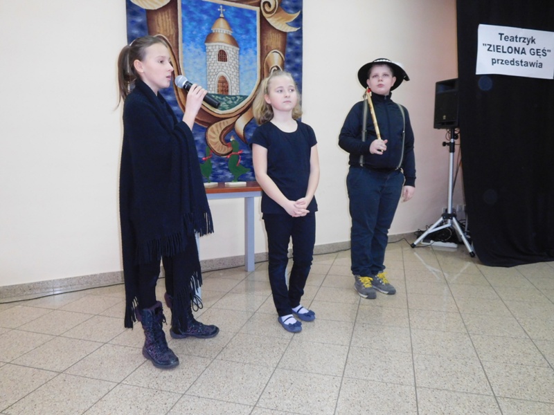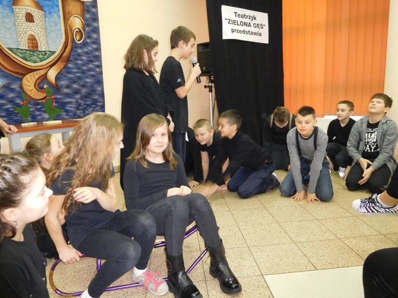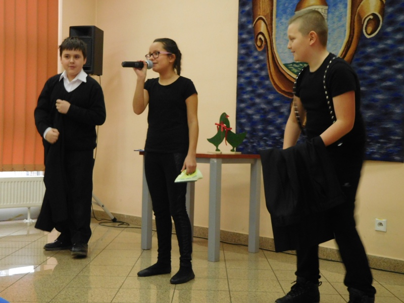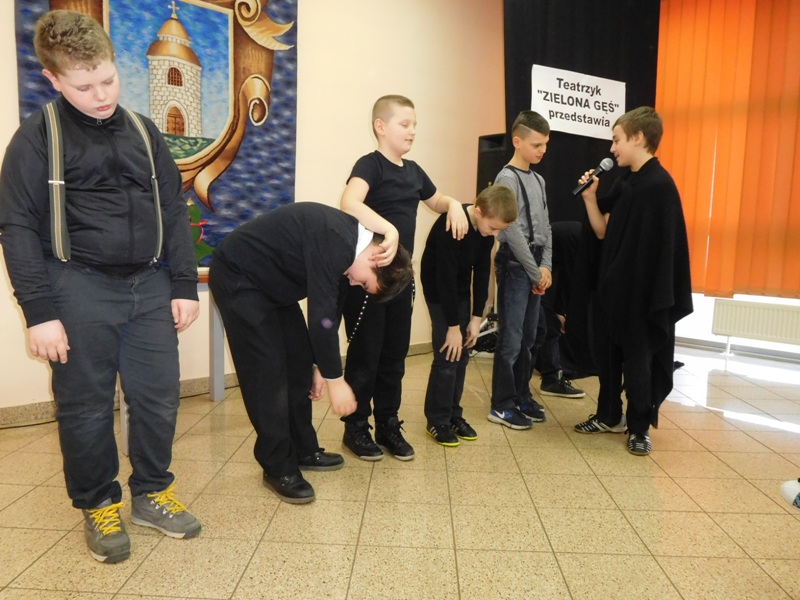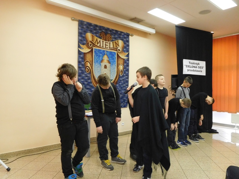 12 lutego klasa V "d" odegrała dla uczniów klas pierwszych imielińskiego gimnazjum przedstawienie, którego scenariusz stworzono w oparciu o teksty autorstwa Konstantego Ildefonsa Gałczyńskiego. Sceny udzieliła - jak zawsze życzliwa - Biblioteka Miejska w Imielinie. Piątoklasiści zaprezentowali starszym kolegom popularne, pełne absurdalnego humoru miniatury teatralne, m.in. "Pozytywnego górala", "Żarłoczną Ewę", "Siedmiu braci śpiących" czy "Biurokratę na wakacjach"; zaśpiewali również 4 piosenki o przedmiotach codziennego użytku: "Durszlak", "Szelki", "Żelazko" i "Maszynkę do mięsa". To już 3 przedstawienie, które klasa przygotowała. Rok temu, w grudniu, V "d" wystawiła „Opowieść wigilijną”, a tuż przed wakacjami humorystyczną sztukę pt. „Książę szuka żony”. Tym razem uczniowie zmierzyli się z zadaniem daleko bardziej poważnym. Wzięli bowiem na warsztat tekst literacki, który chociaż jest humorystyczny i rozrywkowy, to jednak bardzo wymagający zarówno dla aktora jak i dla publiczności. Nazwijmy rzeczy po imieniu: kiedy klasa pierwszy raz przeczytała scenariusz, to polonistka długo musiała tłumaczyć, co powinno śmieszyć i dlaczego... Jednak nie tylko V "d" miała problem z oswojeniem „Zielonej Gęsi”. Zanim publika przyzwyczaiła się do humoru „Teatrzyku Zielona Gęś", podnoszono liczne protesty i głosy oburzenia. Dzisiaj w dobie zwariowanych kabaretów i prześmiewczych satyryków dowcipy Konstantego Ildefonsa Gałczyńskiego już nikogo nie szokują. Ale śmieszą nadal, a przy tym zmuszają do refleksji nad naszym życiem i relacjami między ludźmi. Już wkrótce zaprosimy Was do wspólnej zabawy i rozmyślań podczas oglądania „Najmniejszego Teatrzyku Świata” w wykonaniu klasy V „d”! (film w przygotowaniu!); tymczasem zobaczcie fotorelację.