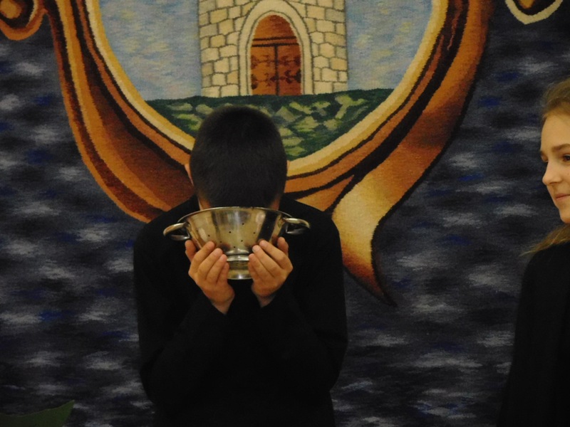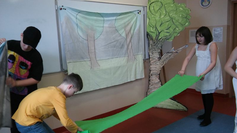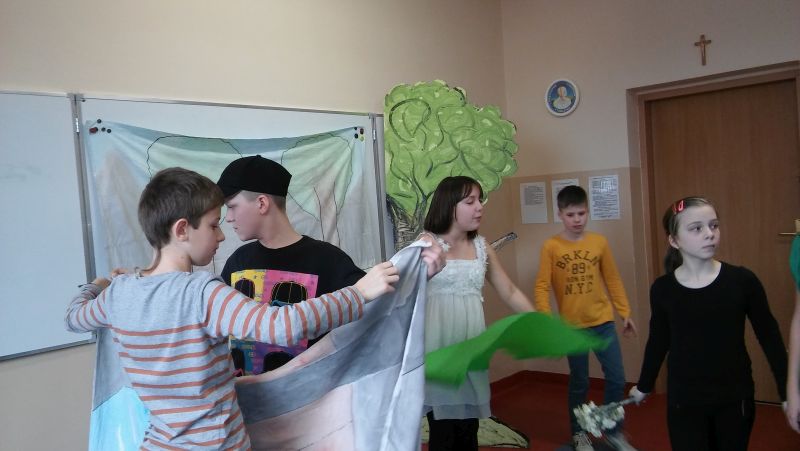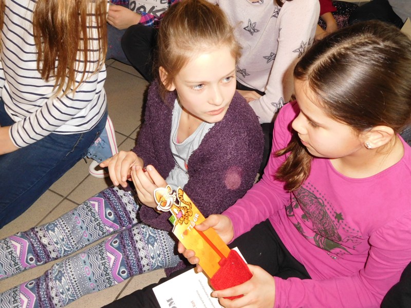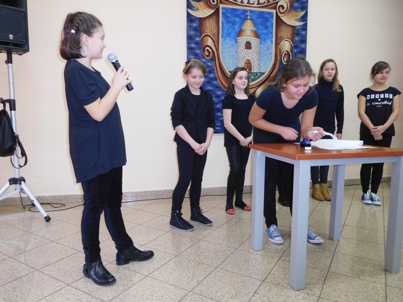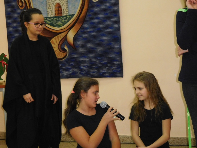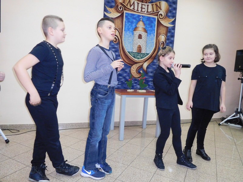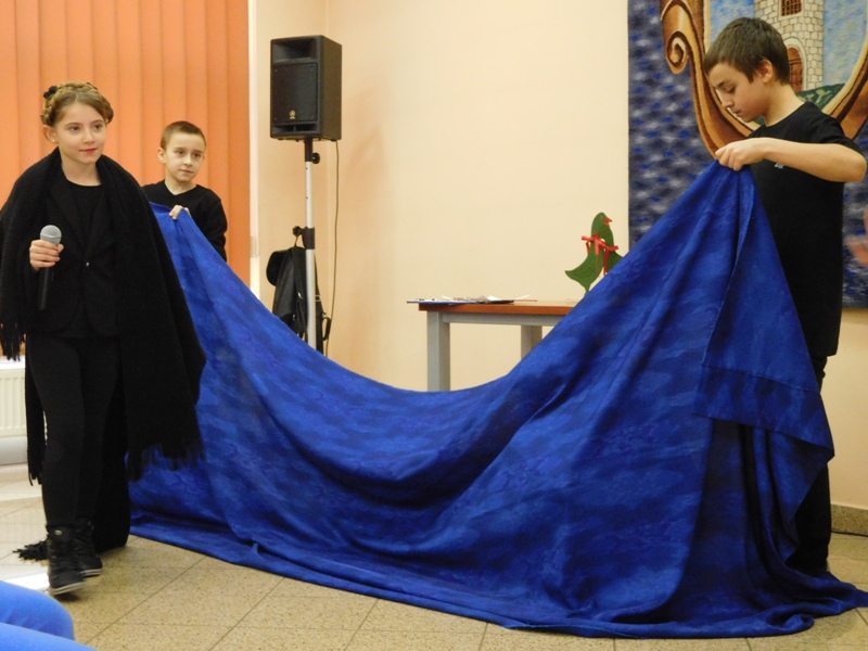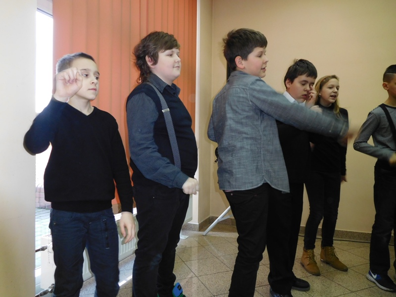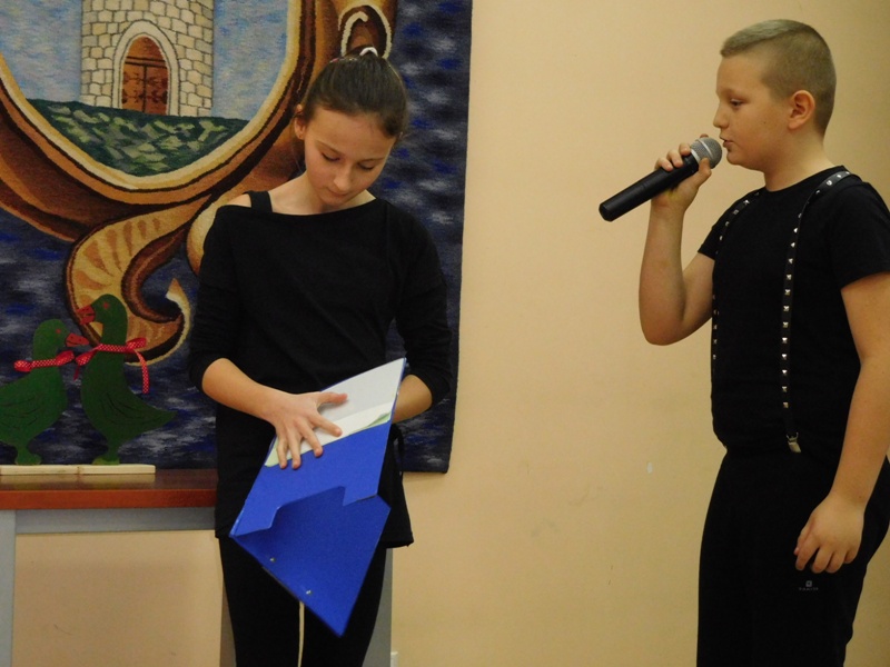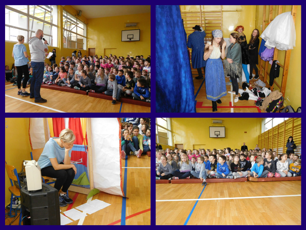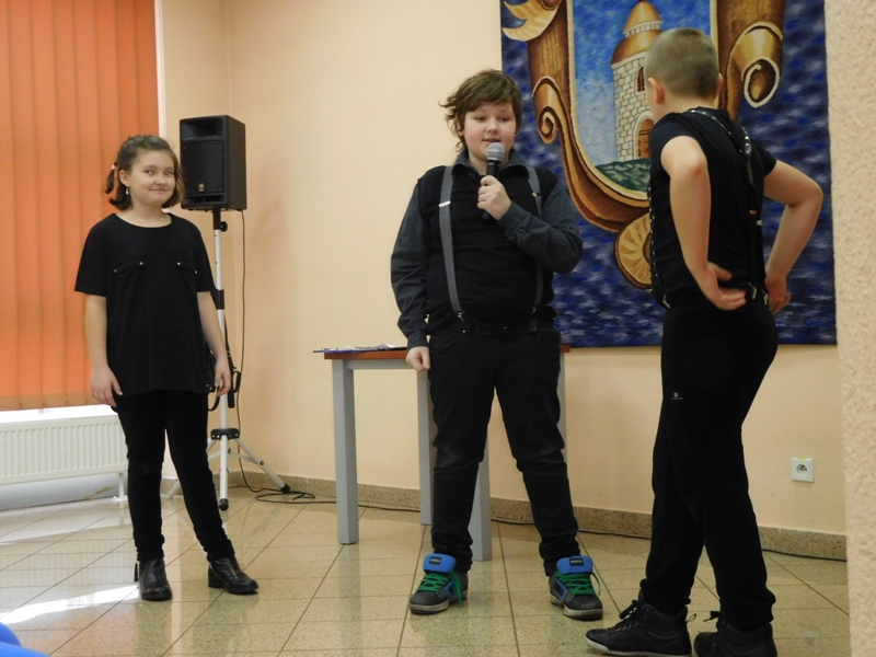 12 lutego klasa V "d" odegrała dla uczniów klas pierwszych imielińskiego gimnazjum przedstawienie, którego scenariusz stworzono w oparciu o teksty autorstwa Konstantego Ildefonsa Gałczyńskiego. Sceny udzieliła - jak zawsze życzliwa - Biblioteka Miejska w Imielinie. Piątoklasiści zaprezentowali starszym kolegom popularne, pełne absurdalnego humoru miniatury teatralne, m.in. "Pozytywnego górala", "Żarłoczną Ewę", "Siedmiu braci śpiących" czy "Biurokratę na wakacjach"; zaśpiewali również 4 piosenki o przedmiotach codziennego użytku: "Durszlak", "Szelki", "Żelazko" i "Maszynkę do mięsa". To już 3 przedstawienie, które klasa przygotowała. Rok temu, w grudniu, V "d" wystawiła „Opowieść wigilijną”, a tuż przed wakacjami humorystyczną sztukę pt. „Książę szuka żony”. Tym razem uczniowie zmierzyli się z zadaniem daleko bardziej poważnym. Wzięli bowiem na warsztat tekst literacki, który chociaż jest humorystyczny i rozrywkowy, to jednak bardzo wymagający zarówno dla aktora jak i dla publiczności. Nazwijmy rzeczy po imieniu: kiedy klasa pierwszy raz przeczytała scenariusz, to polonistka długo musiała tłumaczyć, co powinno śmieszyć i dlaczego... Jednak nie tylko V "d" miała problem z oswojeniem „Zielonej Gęsi”. Zanim publika przyzwyczaiła się do humoru „Teatrzyku Zielona Gęś", podnoszono liczne protesty i głosy oburzenia. Dzisiaj w dobie zwariowanych kabaretów i prześmiewczych satyryków dowcipy Konstantego Ildefonsa Gałczyńskiego już nikogo nie szokują. Ale śmieszą nadal, a przy tym zmuszają do refleksji nad naszym życiem i relacjami między ludźmi. Już wkrótce zaprosimy Was do wspólnej zabawy i rozmyślań podczas oglądania „Najmniejszego Teatrzyku Świata” w wykonaniu klasy V „d”! (film w przygotowaniu!); tymczasem zobaczcie fotorelację.