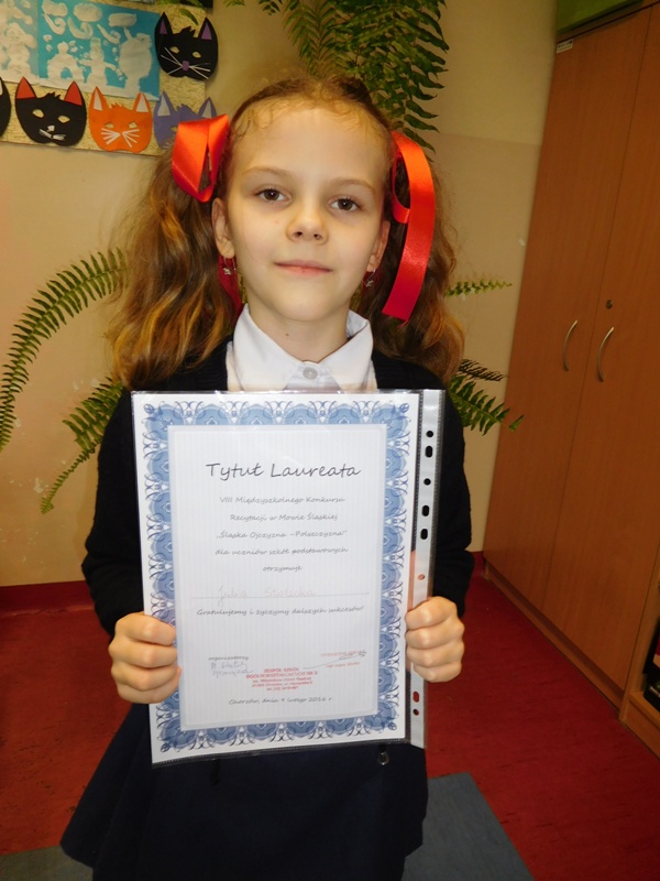 Julia Stolecka z klasy II b została Laureatką VIII Międzyszkolnego konkursu Recytacji w Mowie Śląskiej i będzie reprezentowała naszą szkołę w Finale Konkursu „Śląska Ojczyzna Polszczyzna” 18 marca 2016 r. w Chorzowie.