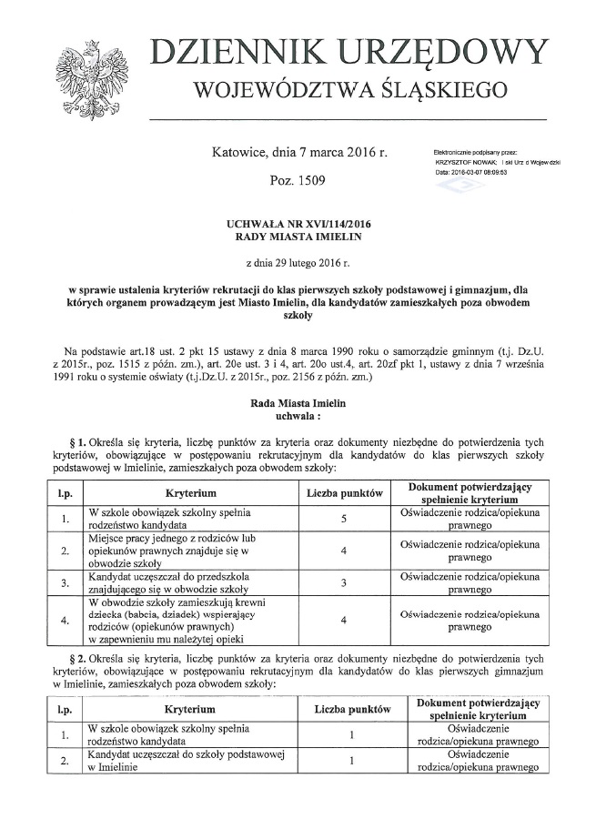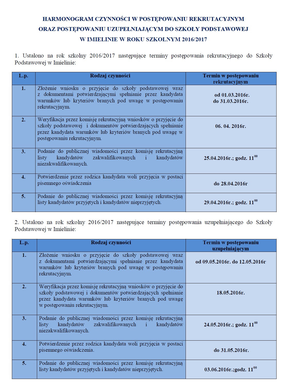 HARMONOGRAM CZYNNOŚCI W POSTĘPOWANIU REKRUTACYJNYM ORAZ POSTĘPOWANIU UZUPEŁNIAJĄCYM DO SZKOŁY PODSTAWOWEJ W IMIELINIE W ROKU SZKOLNYM 2016/2017