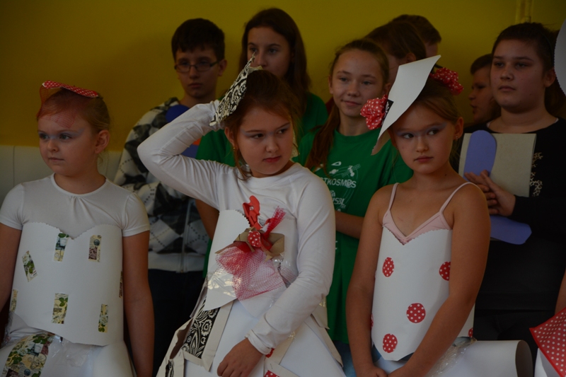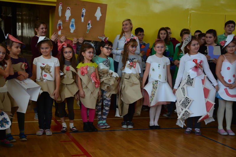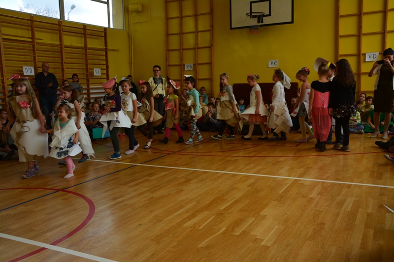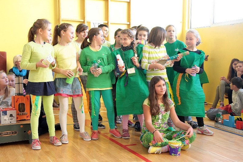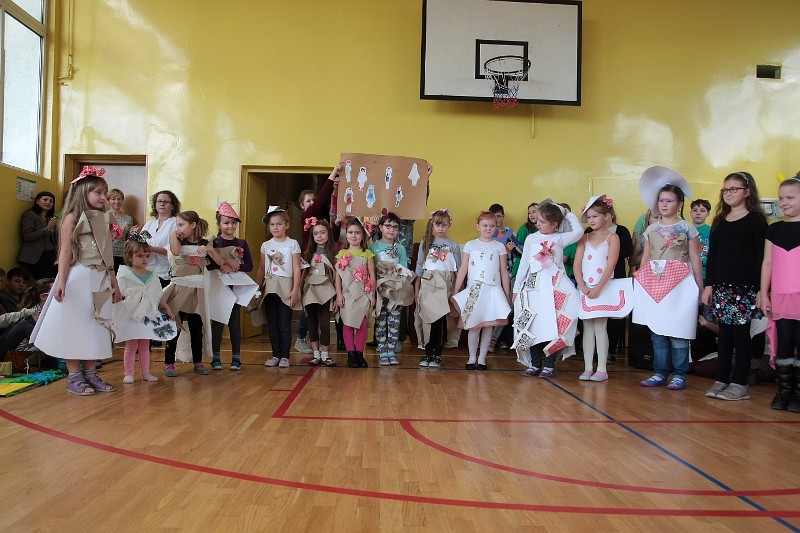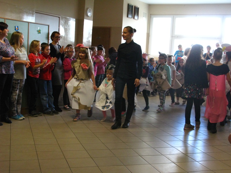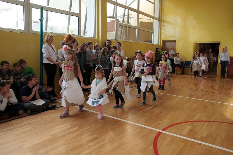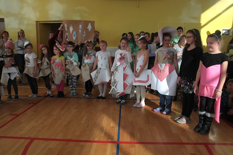 Akcję "Sprzątanie Świata" w naszej szkole zakończył pokaz mody ekologicznej. Jak coś ładnego zrobić z czegoś niepotrzebnego, wymyśliły nasze małe stylistki oraz panie ze świetlicy szkolnej. Stroje zostały wykonane z resztek szarego papieru, bibuły, papierowych tacek i innych surowców wtórnych. Modelki z klas I-III dzielnie znosiły przygotowania w szkolnej garderobie, by móc pięknie zaprezentować się na wybiegu. Pokaz oglądali z wielkim zapałem uczniowie klas starszych oraz rówieśnicy modelek. Wszystkim występ bardzo się podobał, co zostało potwierdzone gromkimi brawami.