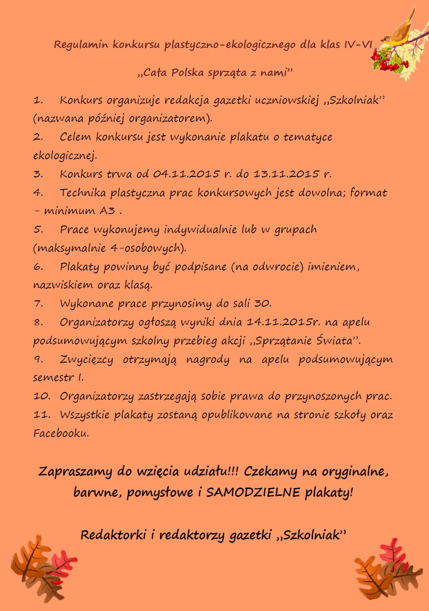 Zapraszamy również do udziału w konkursie ogłoszonym przez redakcję gazetki "Szkolniak".