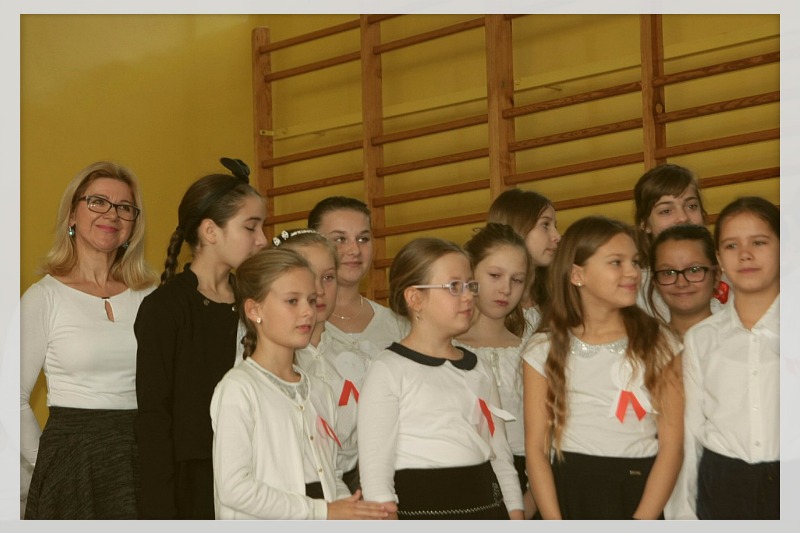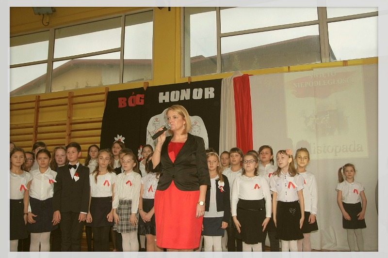 Narodowe Święto Niepodległości w naszej szkole uczczono poprzez podniosłą akademię, która odbyła się we wtorek, 10 listopada. Uroczystość została przygotowana przez uczniów klas: III "a" i IV "d" pod kierunkiem p. Katarzyny Kokoszczyk. Wiązankę pieśni patriotycznych - m.in. "Rotę" i "Szarą piechotę" - zaprezentował szkolny zespół "Koralinki" na czele z p. Krystyną Paluch. Podczas apelu przypomniane zostały ważne wydarzenia historyczne, recytowano również wiersze o tematyce ojczyźnianej. Występom artystycznym towarzyszyła nastrojowa prezentacja multimedialna.