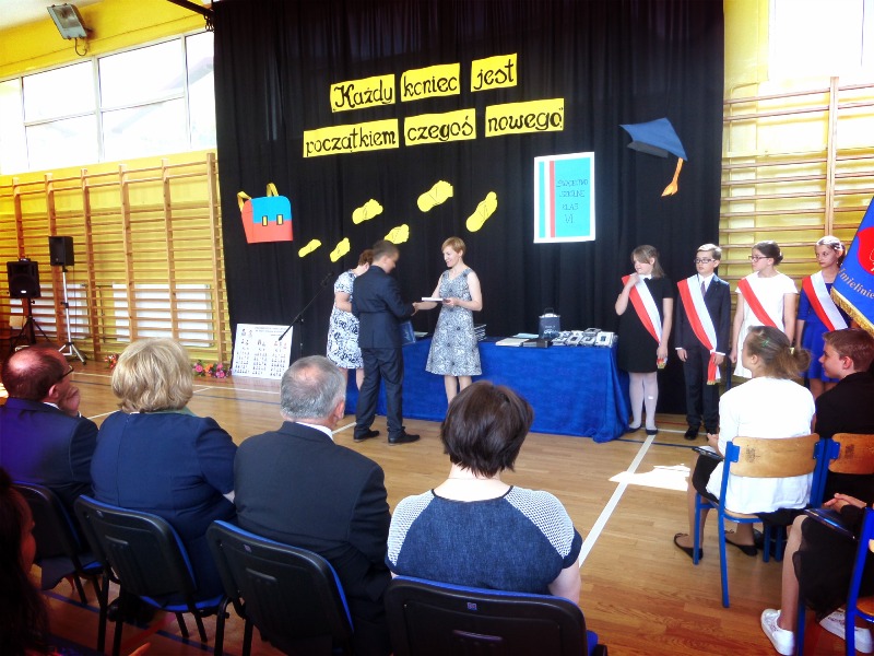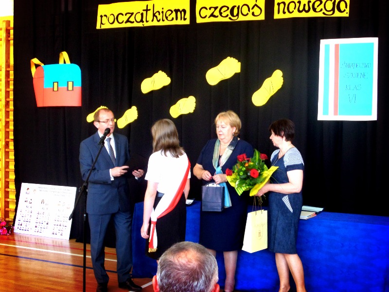 Uroczysta akademia po?egnalna z udzia?em w?adz miasta rozpocz??a si? o 10:30. Wr?czone zosta?y ?wiadectwa oraz nagrody ksi??kowe za osi?gni?cia w nauce, prac? w samorz?dzie uczniowskim oraz w poczcie sztandarowym. Burmistrz Miasta Imielin, Pan Jan Chwi?dacz, oraz Przewodnicz?ca Rady Miasta, Pani Bernadeta Ficek, dodatkowo uhonorowali uczniów/uczennice, którzy uzyskali ?redni? powy?ej 5,0. Specjalne wyró?nienie otrzyma?a Natalia Mondry z klasy VI „c”, która w minionym roku szkolnym zdoby?a tytu? laureatki w kuratoryjnym Konkursie Przedmiotowym z J?zyka Polskiego oraz tytu? finalistki w Konkursie Przedmiotowym z Matematyki. Pani Dyrektor Gabriela Szolczewska wraz z wychowawcami klas VI: Urszul? Haber, Gabriel? Iwanek-Wilk oraz Markiem Pi?k? przekaza?a na r?ce rodziców szóstoklasistów listy gratulacyjne oraz podzi?kowania za prac? na rzecz szko?y. Wyst?pi?a równie? Pani Aldona Ficek – przewodnicz?ca Rady Rodziców – która podzi?kowa?a za 6-letni? edukacj? i wychowanie dzieci. G?os zabra? tak?e pan burmistrz, który pochwali? szko?? za wysoki poziom nauczania, za? na r?ce Pani Gabrieli Szolczewskiej z?o?y? podzi?kowania za 6-letnie sprawowanie funkcji dyrektora szko?y.