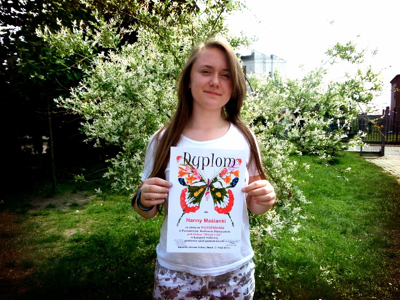 Serdecznie gratulujemy Hannie Ma¶lance, uczennicy klasy VI "a", która w Powiatowym Konkursie Plastycznym "Motyle i tyle" zorganizowanym przez Bieruński O¶rodek Kultury zdobyła wyróżnienie. Hania wykonuje prace, wykorzystuj±c wiele technik plastycznych, a jej inspiracje s± bardzo różnorodne. Od dwóch lat jest aktywn± członkini± szkolnego koła plastycznego "Po-tworzymy".