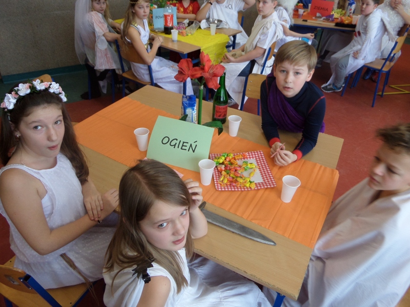 Uczta bogów olimpijskich poł±czona z konkursem wiedzy o mitach w klasie 5 "a" odbyła się 29 stycznia. Starły się ze sob± 4 drużyny: WODA, OGIEŃ, ZIEMIA I POWIETRZE. Walka była bardzo wyrównana, ale fortuna najbardziej sprzyjała żywiołowi wody. Uczestnikom/uczestniczkom dopisywały zarówno humory, jak i apetyty - pochłonięto takie ilo¶ci nektaru i ambrozji, jakich na Olimpie dawno już nie widziano.