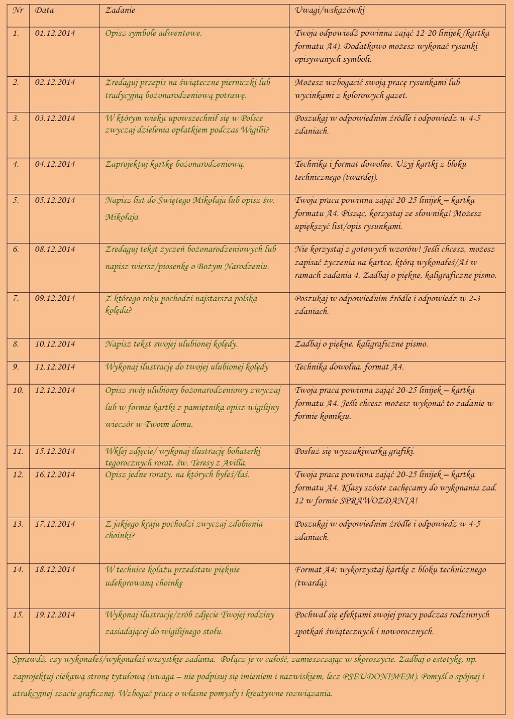 Z my¶l± o naszych "zapominalskich" publikujemy listę wszystkich zadań z kalendarza adwentowego:) Gratulujemy tym, którzy każdego dnia pamiętali o odpisaniu kolejnych poleceń.
