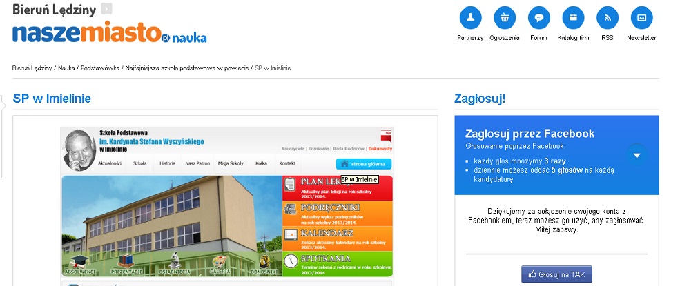 Organizatorzy konkursu pytaj±: "Która szkoła podstawowa w powiecie bieruńsko-lędzińskim jest najfajniejsza? Gdzie dzieci nie tylko siedz± w szkolnych ławkach, ale i poznaj± ¶wiat? Gdzie uczniowie mog± próbować swoich sił w różnych dziedzinach życia? Gdzie można znaleĽć w¶ród pedagogów wsparcie? Chcemy poszukać takiej placówki, gdzie wszystkie te elementy tworz± jedn± cało¶ć. Głosować mog± uczniowie, ich rodziny, pedagodzy i absolwenci. Głosowanie potrwa do 8 maja do godz. 23.59. Codziennie możecie oddawać pięć głosów za pomoc± tradycyjnych kliknięć oraz pięć głosów za pomoc± Facebooka. Głosy oddane przez portal społeczno¶ciowy mnożone s± przez trzy. O zwycięskiej szkole napiszemy w Dzienniku Zachodnim i na portalu bierun.naszemiasto.pl"