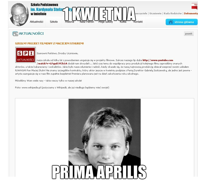 serdecznie dziękujemy za wszystkie maile gratulacyjne i osobiste wyrazy uznania w zwi±zku z planowanym przez szkołę projektem filmowym z Maćkiem Stuhrem w roli głównej. Wczoraj (1 kwietnia) na nasz± stronę internetow± zajrzało niemal 800 zaintrygowanych użytkowników!;) Jednocze¶nie informujemy, że był to tylko nasz żart primaaprilisowy:)