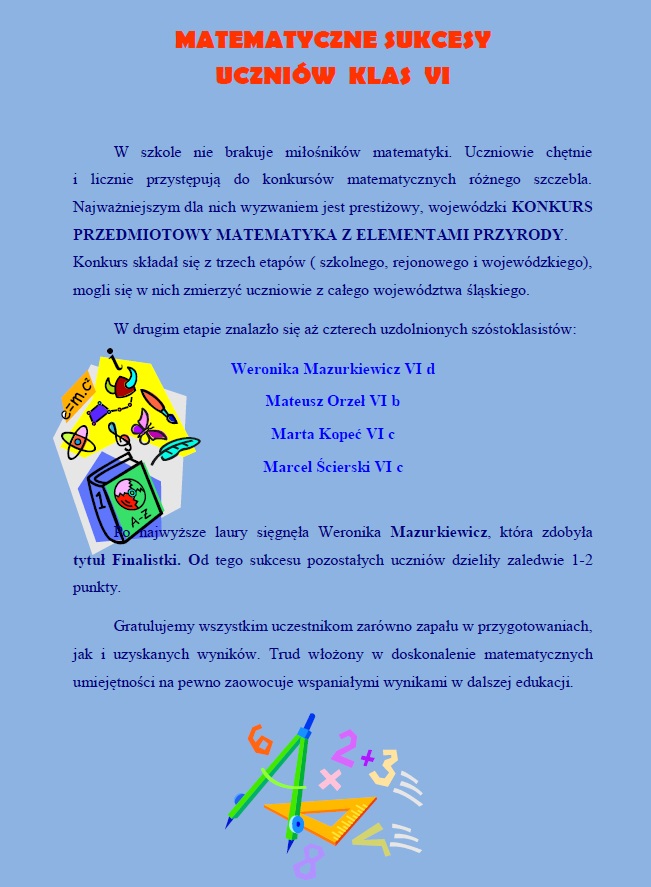 Nagrodę za najlepsz± pracę literack± otrzymał Dominik Kłaput, również uczeń bieruńskiej SP 3, drugie miejsce przyznano Natalii Filipczuk z SP 3 w Lędzinach, a trzecie miejsce zajęła Gabriela Jasińska z SP 1 w Lędzinach. Wyróżnieni zostali: Jakub Różycki z SP w Imielinie oraz Aleksandra BliĽniak i Julia Celarek z SP 3 w Bieruniu.