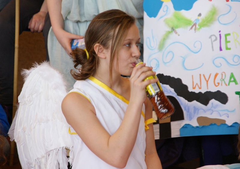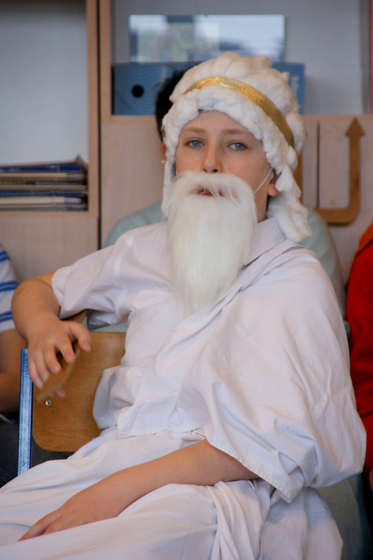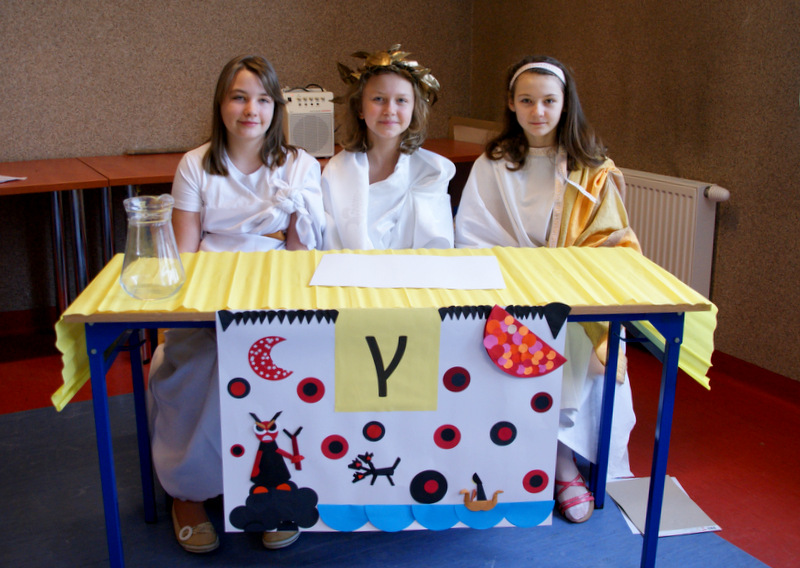 Lekcje mitologiczne s± jednymi z ulubionych w¶ród pi±toklasistów. Bogowie, którzy zachowuj± się zupełnie jak ludzie, dzielni herosi i przedziwne potwory inspiruj± uczniowsk± wyobraĽnię oraz zachęcaj± do metaforycznych wędrówek w stronę starożytnej Grecji. Zwieńczeniem mitologicznego cyklu lekcji były w tym roku szkolnym: uczty bogów olimpijskich, pokazy mody greckiej oraz konkursy wiedzy o mitach. Ponadto wszyscy uczniowie napisali test, który stał się podstaw± do wyłonienia klasowych reprezentacji do II etapu konkursu mitologicznego.