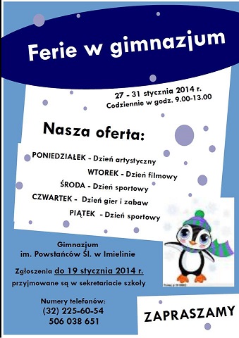 Zachęcamy także do poznania ciekawych propozycji spędzenia wolnego czasu, które oferuj± na czas ferii: Gimnazjum im. Powstańców ¦l±skich, Biblioteka Publiczna w Imielinie oraz Dom Kultury "Sokolnia".