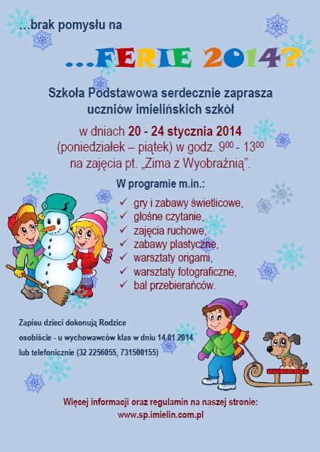 szkoła podstawowa również wł±cza się w organizację ferii zimowych 2014 w naszym mie¶cie. Zapraszamy do zapoznania się z nasz± ofert± (PATRZ - OSTATNI PLAKAT) oraz prosimy o uważne przeczytanie regulaminu "Ferii z WyobraĽni±". Regulamin i karta uczestnika do pobrania z naszej strony (zakładka: Dokumenty). Szczegółowe informacje o "Feriach z WyobraĽni±" na zebraniach w dniu 14.01.2014r. (wtorek). Zapisy do 17 stycznia br.