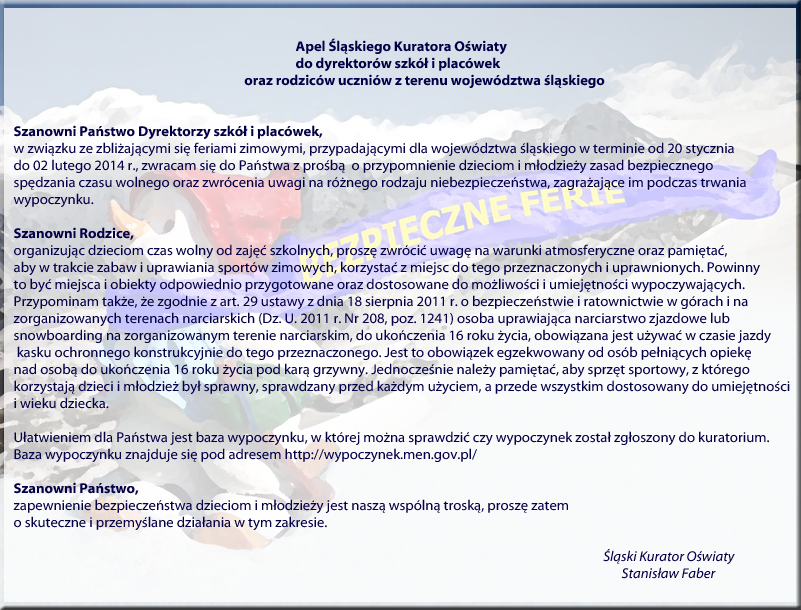 Prosimy o zapoznanie się z listem ¦l±skiego Kuratora O¶wiaty, który w zwi±zku ze zbliżaj±cymi się feriami, wystosował do szkół list, w którym porusza zagadnienia zwi±zane z bezpieczeństwem dzieci i młodzieży w wolnym czasie. Jednocze¶nie informujemy, że w naszej szkole również podczas ferii realizowane będ± zadania, wynikaj±ce z zaangażowania w konkurs "Bezpieczna Szkoła - Bezpieczny Uczeń".