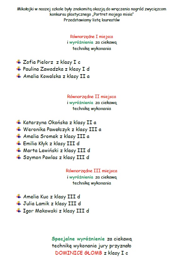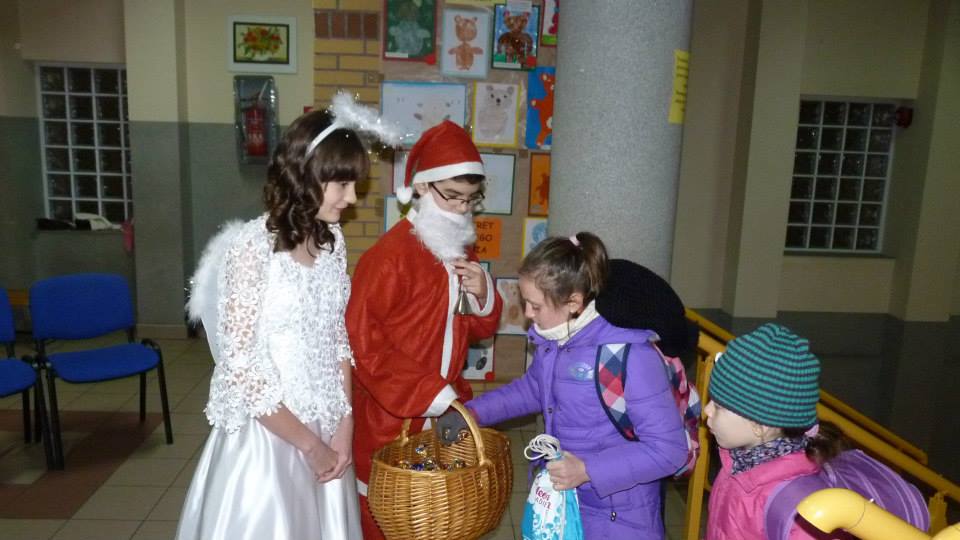 6 grudnia na korytarzach naszej szkoły panuje jeszcze większy gwar niż zwykle. Gromady radosnych "mikołajków" i "mikołajek" ciesz± się na przybycie ¦więtego, który przynosi prezenty wszystkim grzecznym dzieciom (a u nas s± wyłacznie takie). Obdarowujemy się drobnymi upominkami, niektóre z nich zostały wykonane własnoręcznie! W salach oraz na korytarzach pojawiaj± się kolorowe choinki i ¶wiateczne dekoracje. Wychowawcy i nauczyciele, a także Pani Dyrekor przywdziewaj± czerwone stroje, a samorz±d uczniowski częstuje wchodz±cych do szkoły słodko¶ciami. Zapraszamy do zobaczenia fotorelacji z tego, co działo się w naszej szkole w dniu imienin Mikołaja!