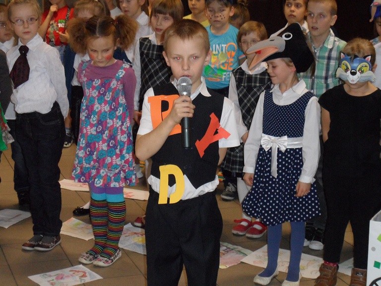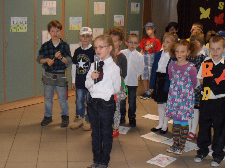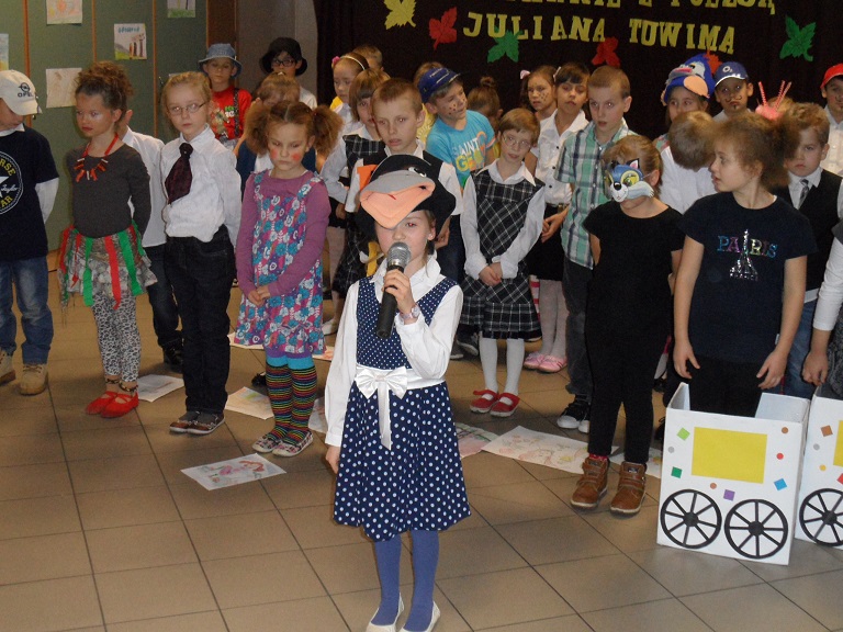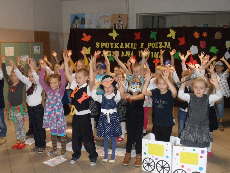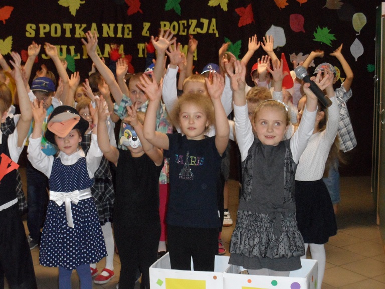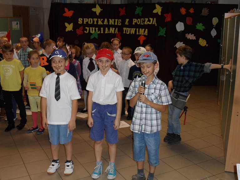 Wieczorkiem poetyckim pożegnali¶my jesień w naszej szkole. Uczniowie klasy II b i II d pod kierunkiem pań: Beaty Balickiej i Małgorzaty Syrek przygotowali dla rodziców spotkanie z poezj± Juliana Tuwima. Mali arty¶ci recytowali wybrane wiersze poety, takie jak: "Lokomotywa", "Rzepka", "Bambo", "SpóĽniony słowik", "Skakanka", "Cuda i dziwy" i wiele innych. ¦piewali jesienne piosenki, którym towarzyszyły pl±sy. Każde dziecko wcieliło się w rolę bohatera, o którym była mowa w wierszu. Pomysłowo¶ć charakteryzacji i barwne rysunki dzieci dodały uroku całemu występowi. Wieczór poetycki zakończył duży aplauz ze strony zgromadzonej publiczno¶ci.