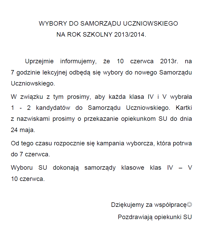 W dniu 21 maja w godzinach 17.00-19.00 odbęd± się zebrania z rodzicami, podczas których nauczyciele zapoznaj± rodziców z proponowanymi ocenami uczniów na koniec roku szkolnego 2012/2013. Nauczyciele, którzy nie posiadaj± wychowastwa będ± w powyższych godzinach oczekiwali na rodziców w pokoju nauczycielskim.
