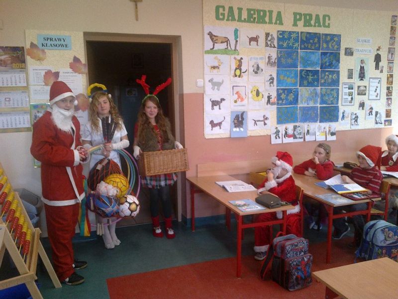 W ten wyj±tkowy dzień do naszej szkoły zawitał Mikołaj z aniołkiem i reniferem. Mieli wy¶mienite humory, więc każdego ucznia, nauczyciela, pracownika czy go¶cia u progi szkoły witali cukierkiem. PóĽniej było tylko więcej i lepiej! Każda klasa otrzymała upominek ufundowany przez firmę DANONE-serki lub actimelki. A nasza Pani Mikołajowa (czyli Pani Dyrektor) zaopatrzyła klasy I i II w sprzęt sportowy. Nawet nauczyciele byli w tym roku grzeczni, więc otrzymali małe upominki od Samorz±du Uczniowskiego.