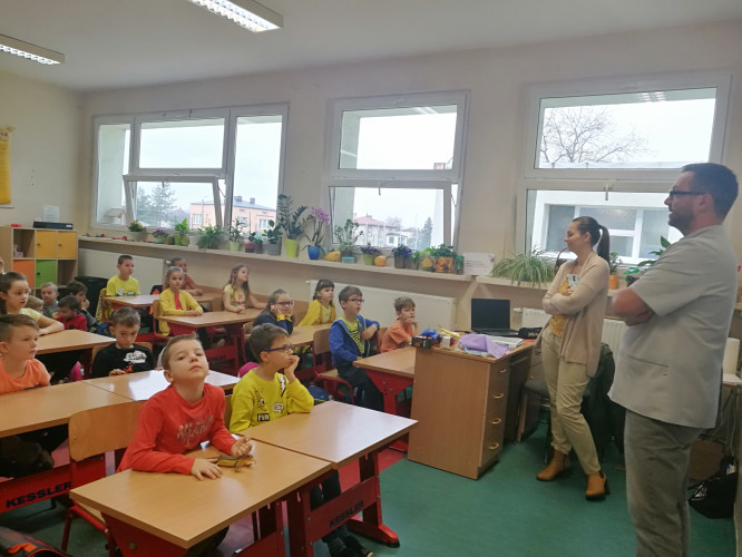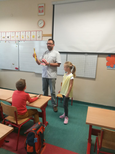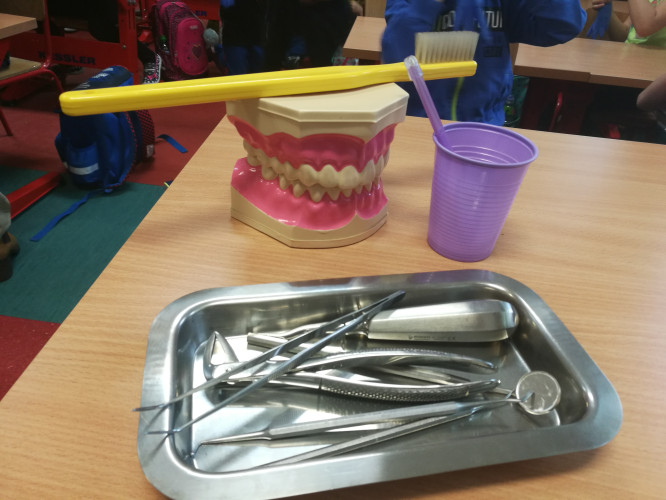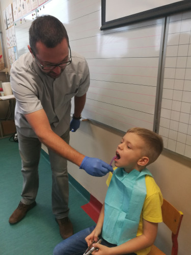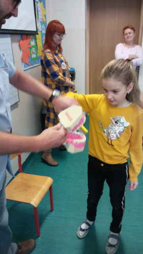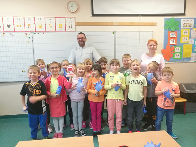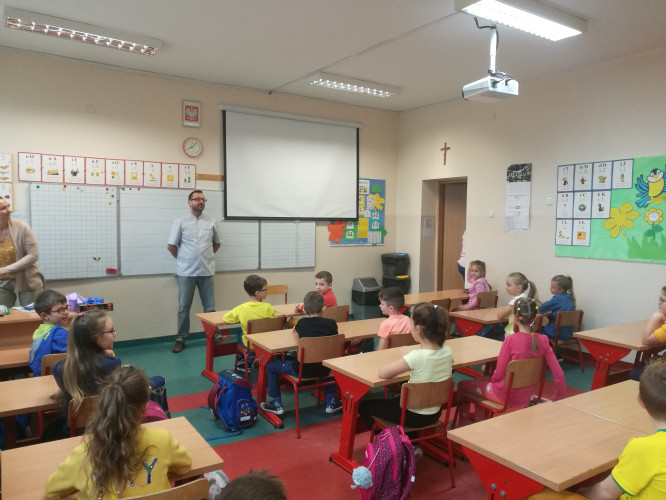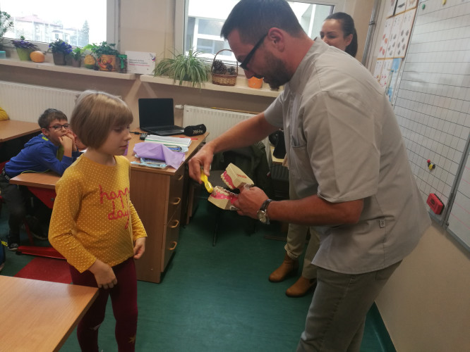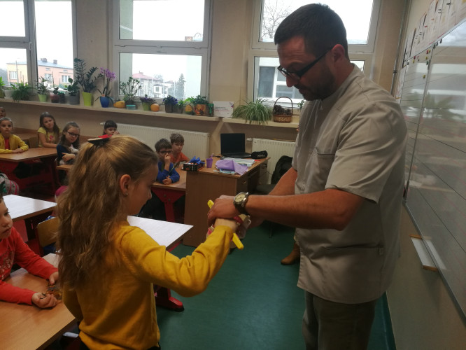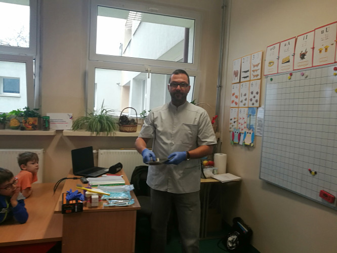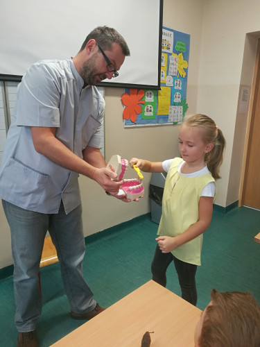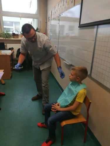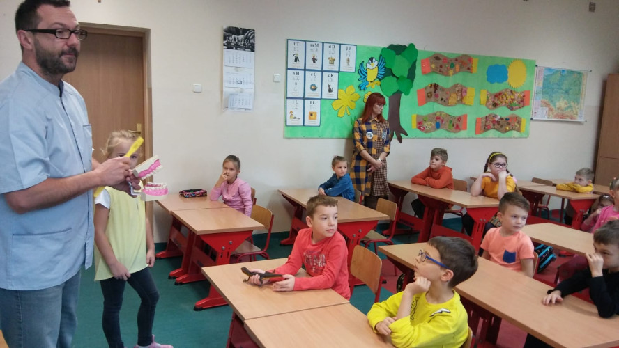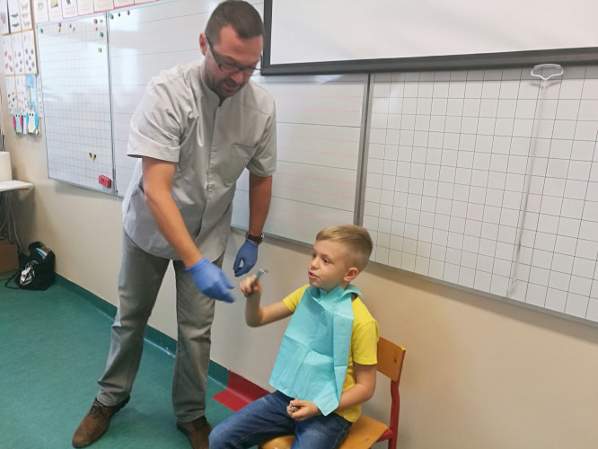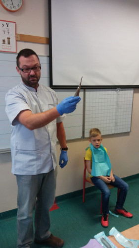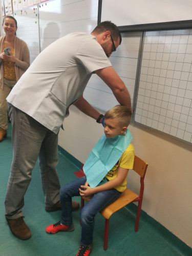 W ramach doradztwa zawodowego, naszych pierwszoklasistów odwiedził gość specjalny – lekarz, chirurg stomatolog, pan Jarosław Kokoszczyk - tata jednego z naszych uczniów. Dzieci dowiedziały się jak wygląda praca stomatologa, jak dbać o jamę ustną, co jeść, żeby mieć zdrowe zęby, jak je prawidłowo myć, bo to też jest sztuka :-). Mogły również zobaczyć jakich narzędzi używa stomatolog w swojej pracy. To była bardzo ciekawa i cenna lekcja.