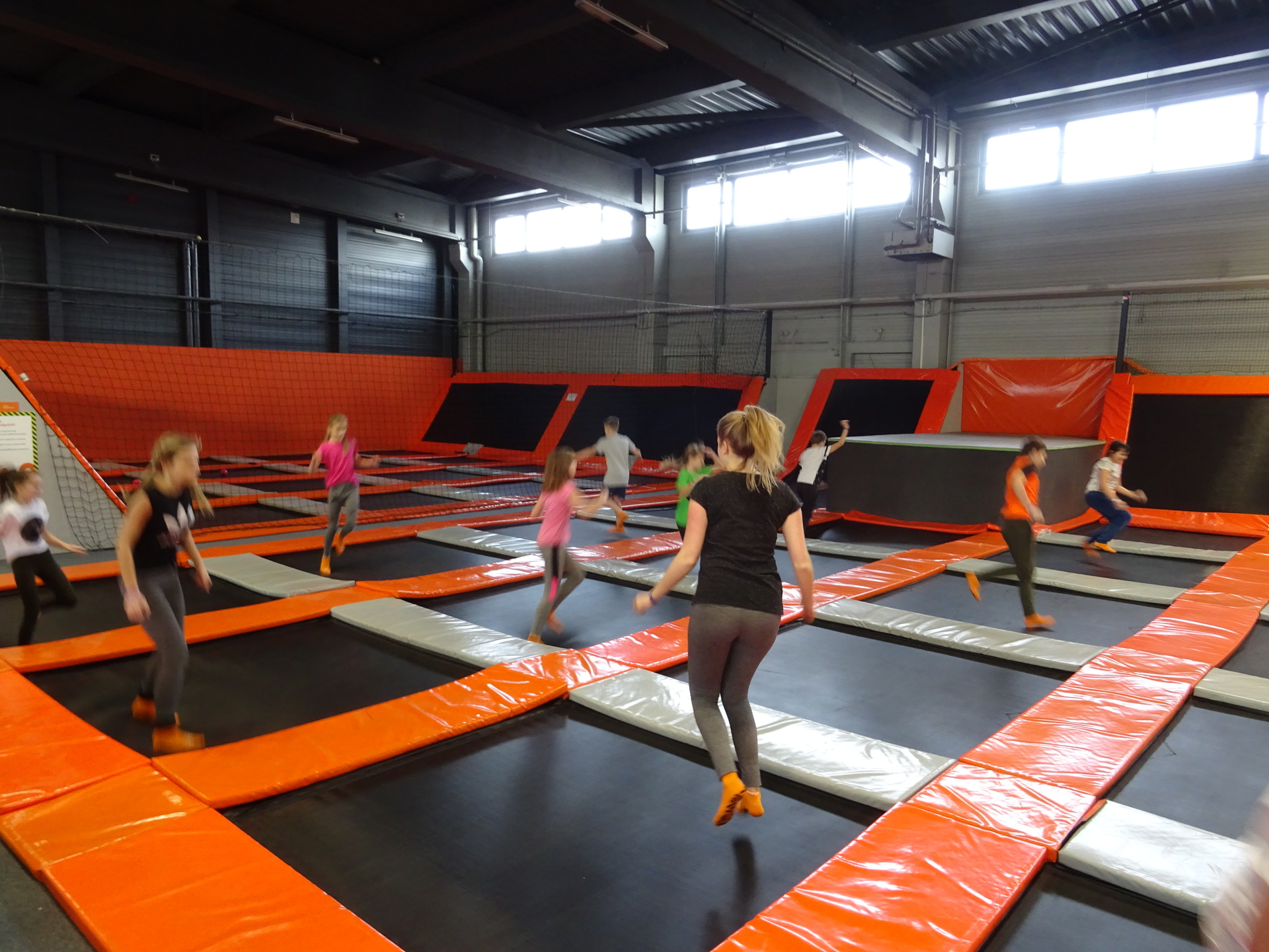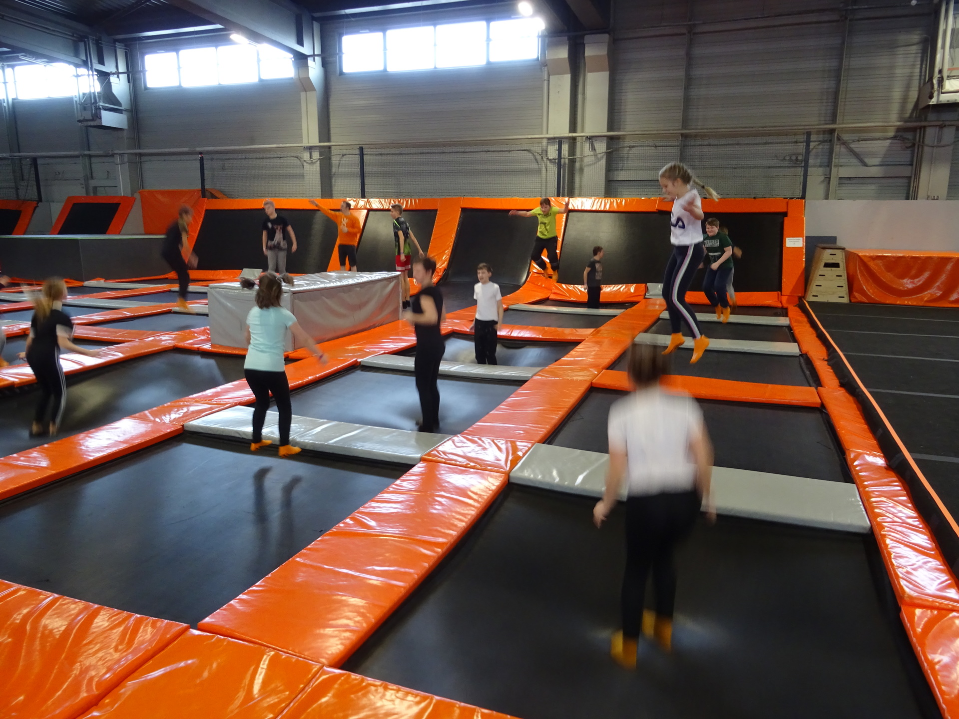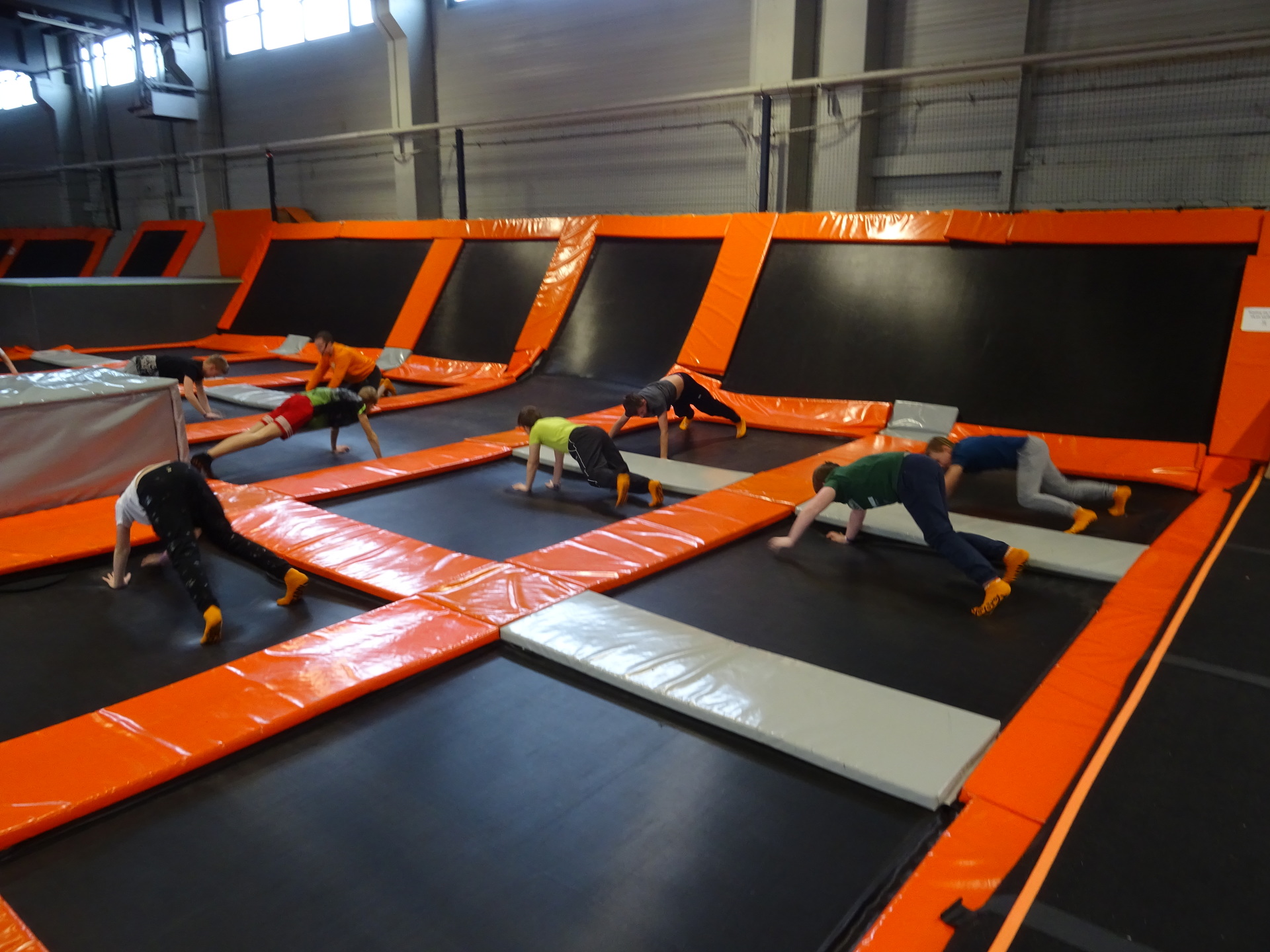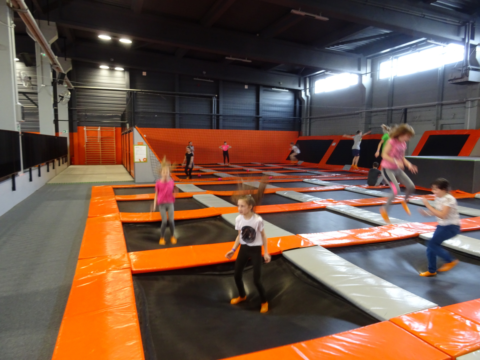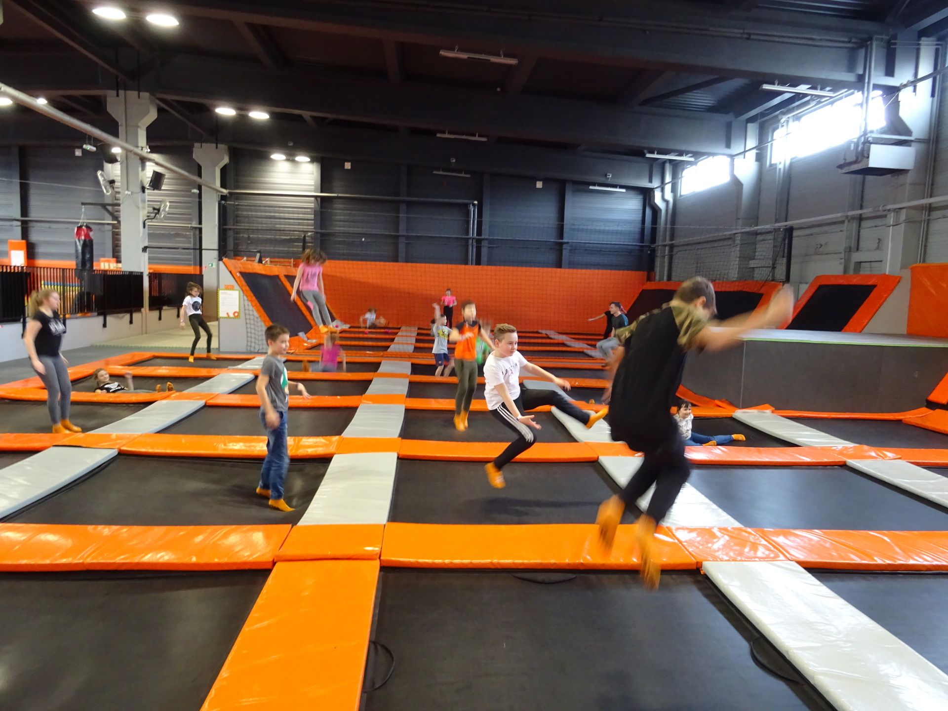 W parku trampolin po zapoznaniu się z zasadami bezpieczeństwa i kultury odbyła się wspólna rozgrzewka na trampolinach prowadzona przez trenera. Po niej każdy próbował swych sił na różnego rodzaju ścieżkach m.in. strefa gladiatorów, basen z gąbkami, trampolina sportowa, ścieżki akrobatyczne. Chętni próbowali swych sił na arenie do zbijaka.