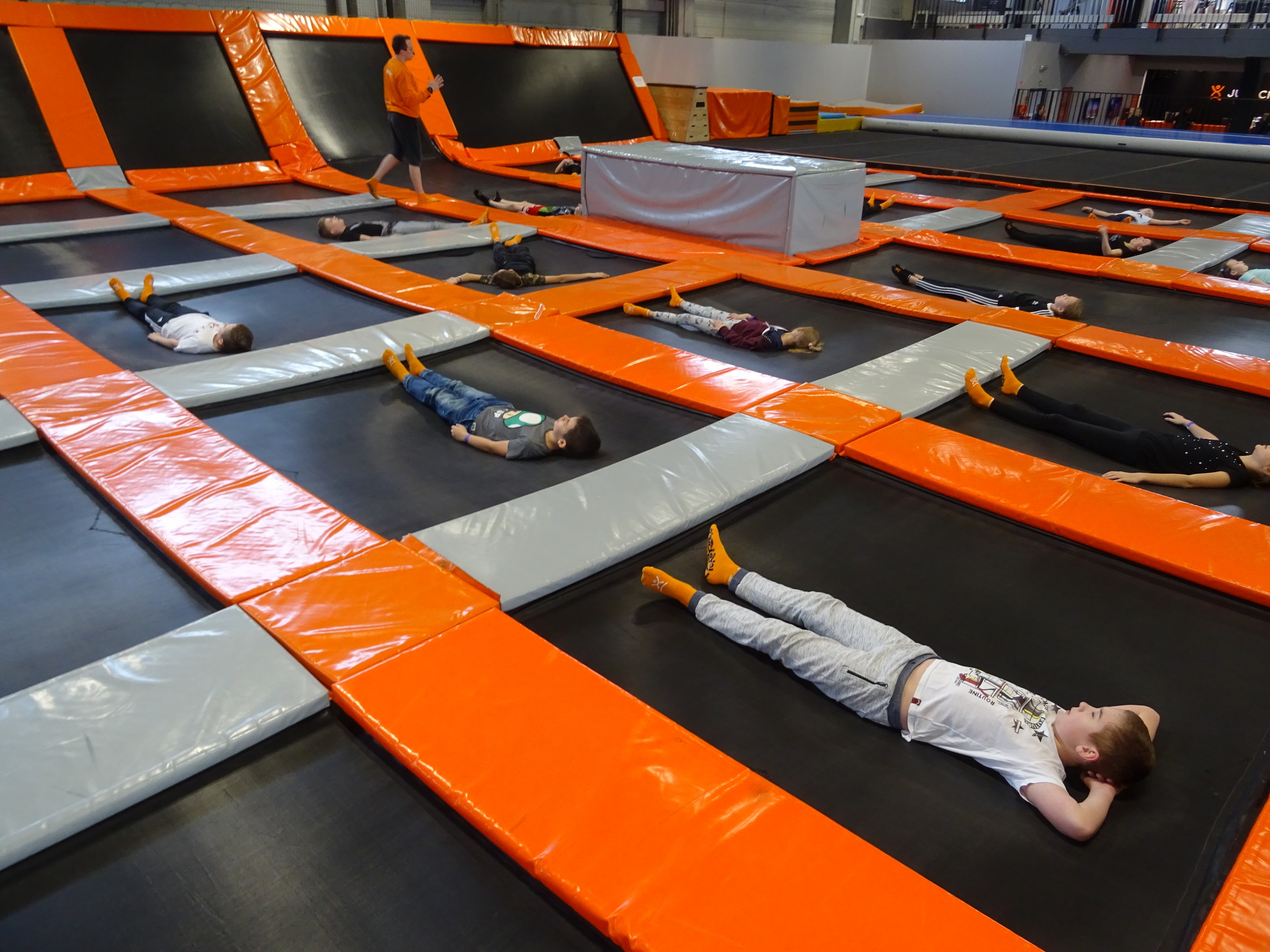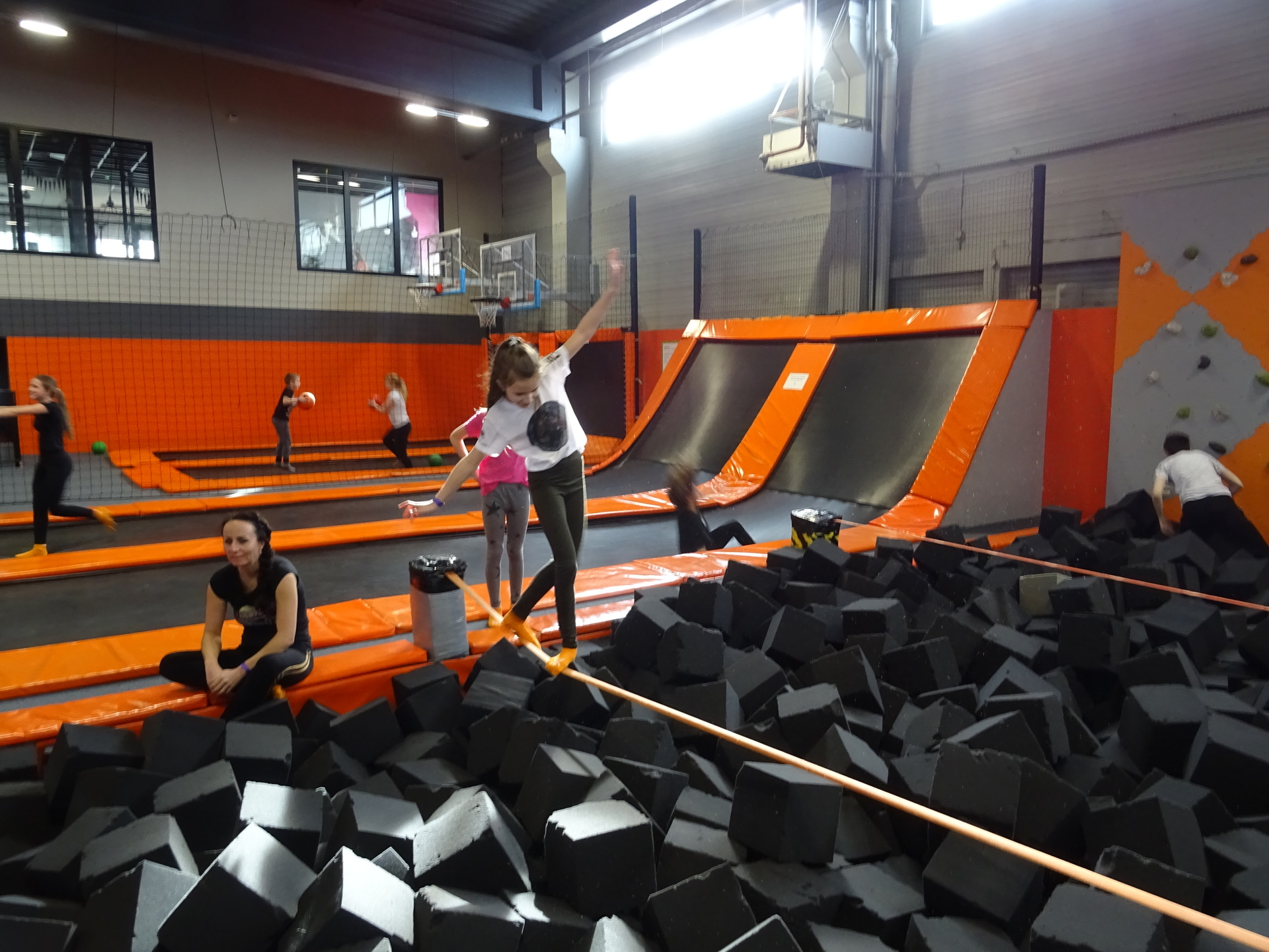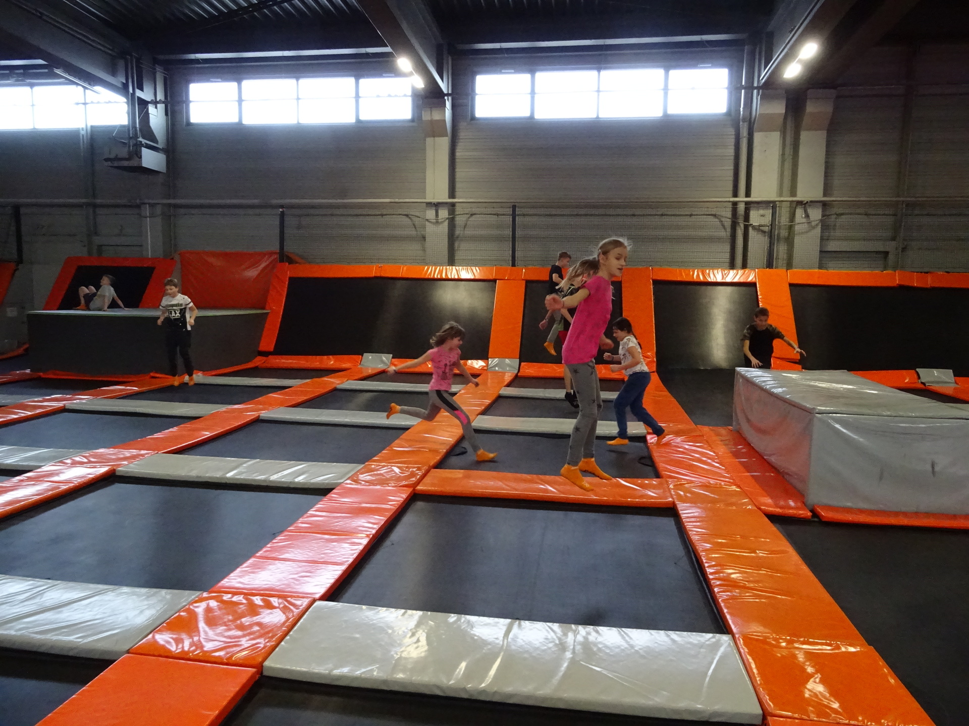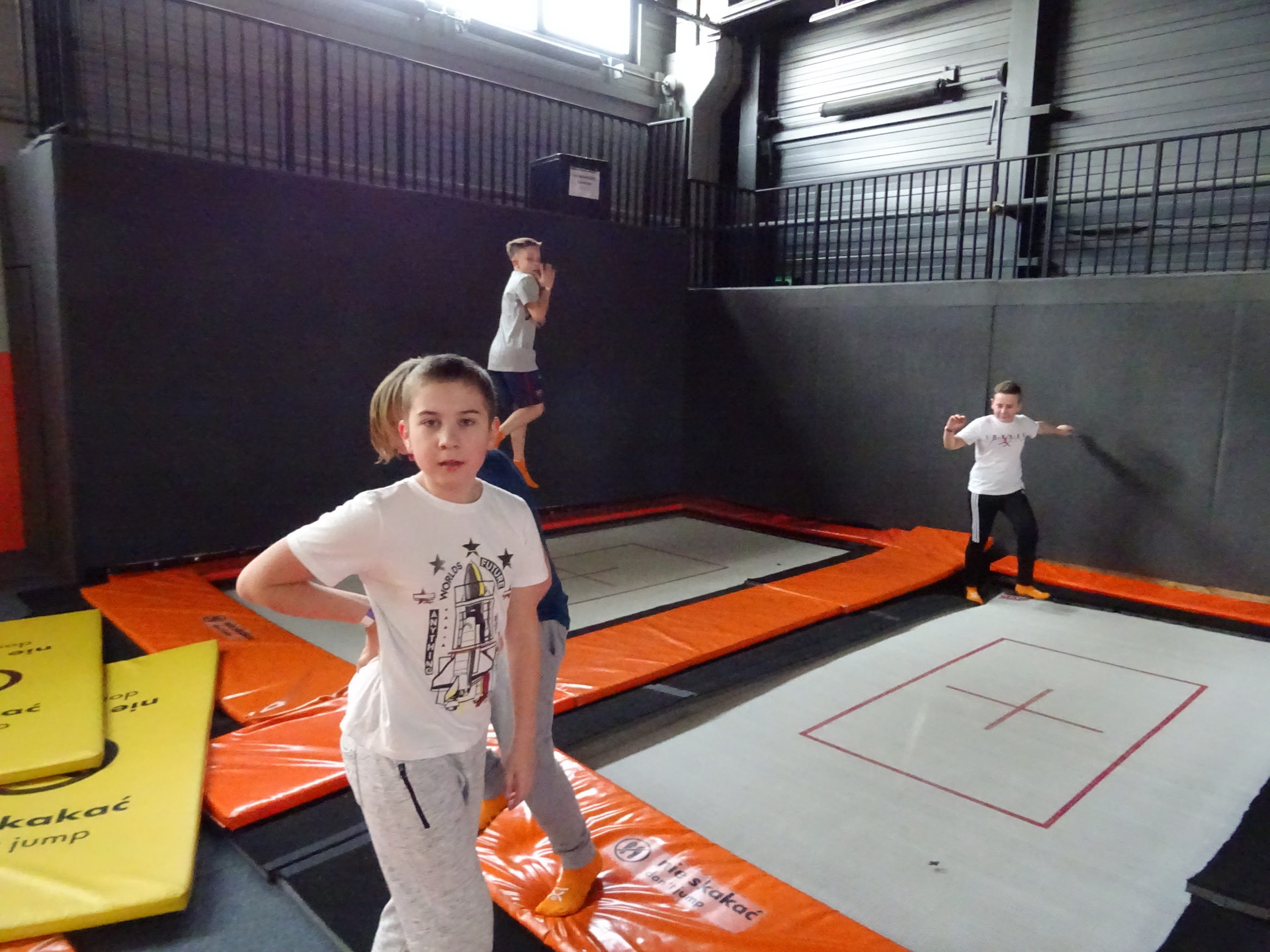 W parku trampolin po zapoznaniu się z zasadami bezpieczeństwa i kultury odbyła się wspólna rozgrzewka na trampolinach prowadzona przez trenera. Po niej każdy próbował swych sił na różnego rodzaju ścieżkach m.in. strefa gladiatorów, basen z gąbkami, trampolina sportowa, ścieżki akrobatyczne. Chętni próbowali swych sił na arenie do zbijaka.