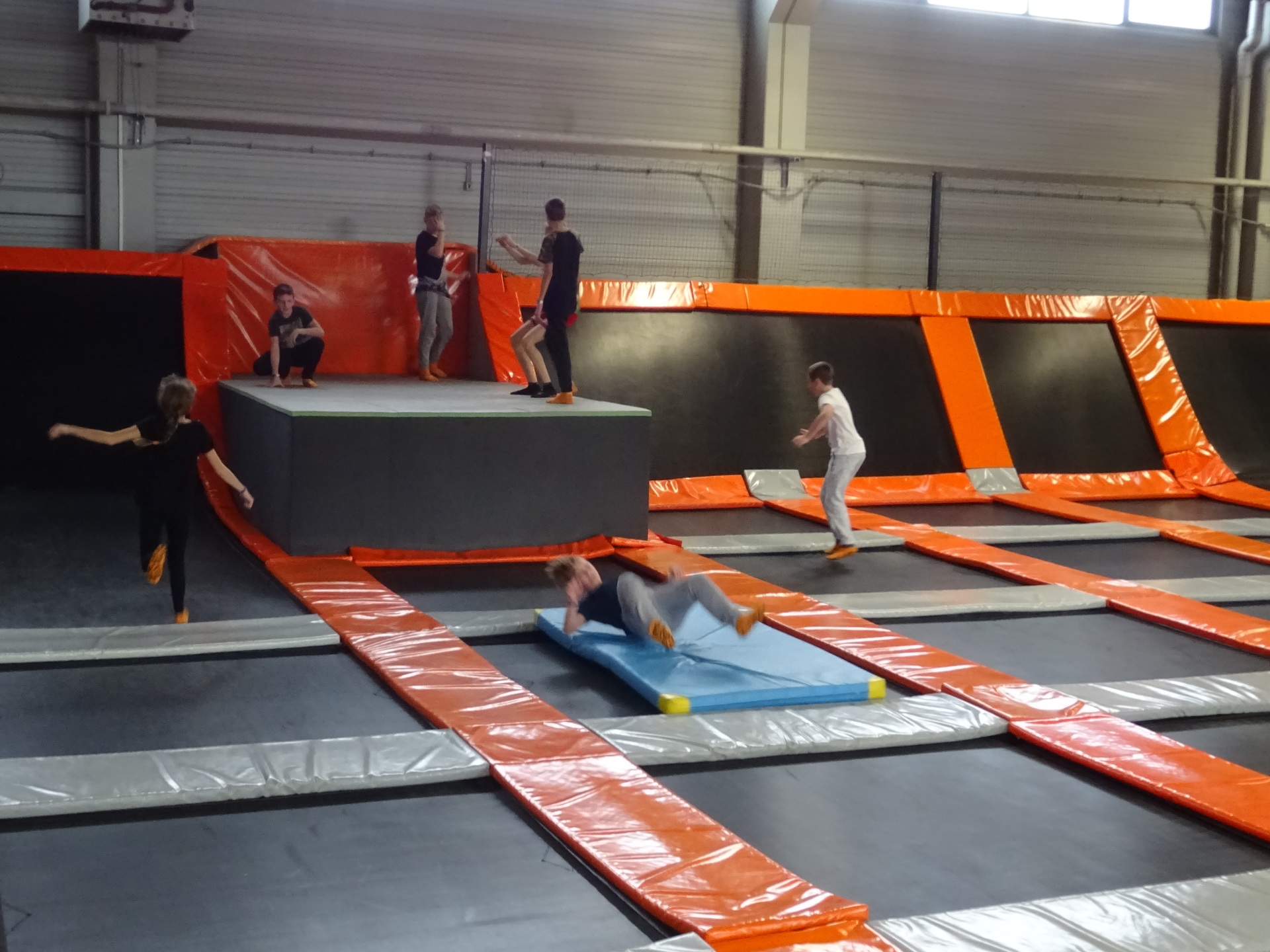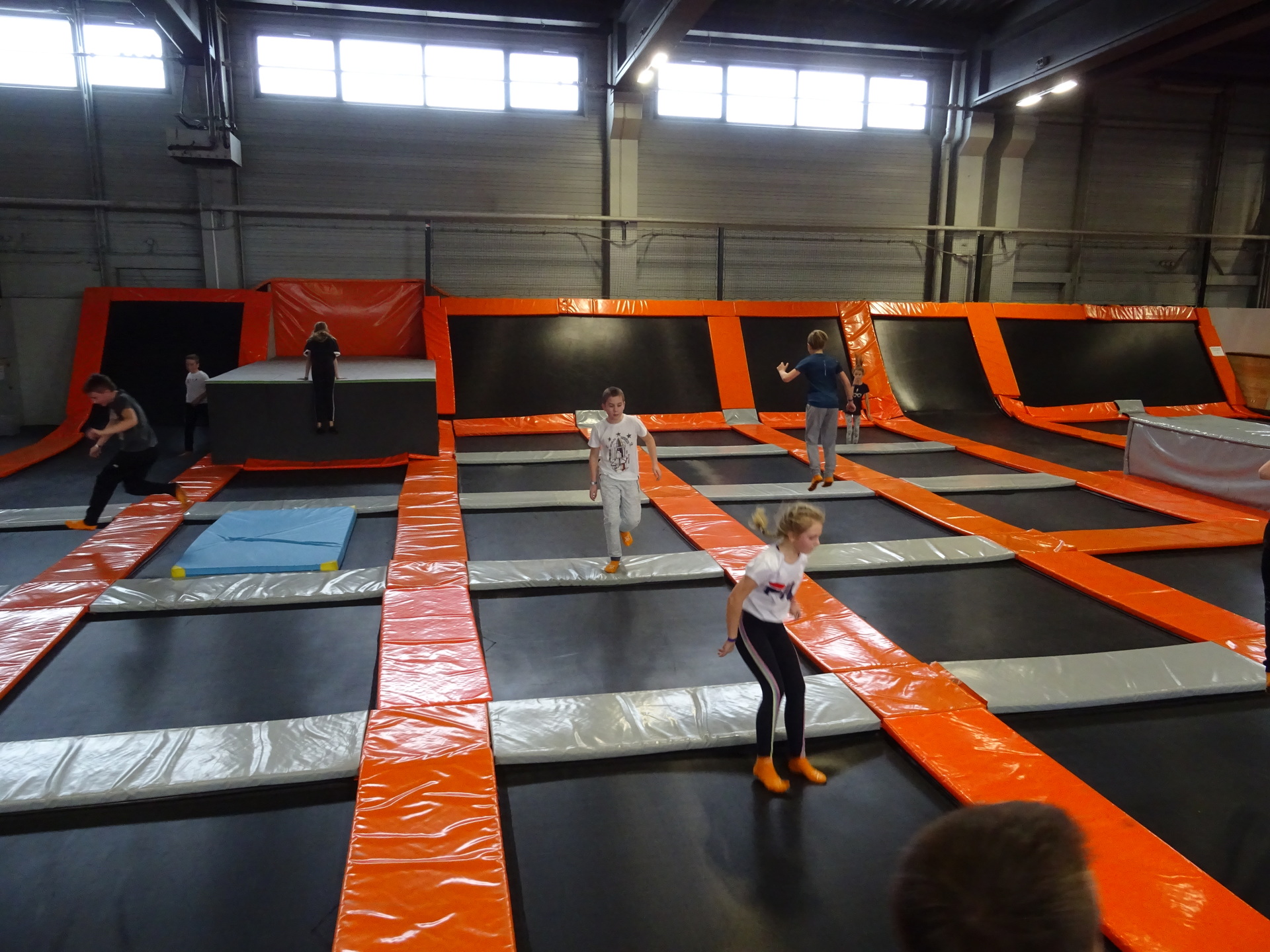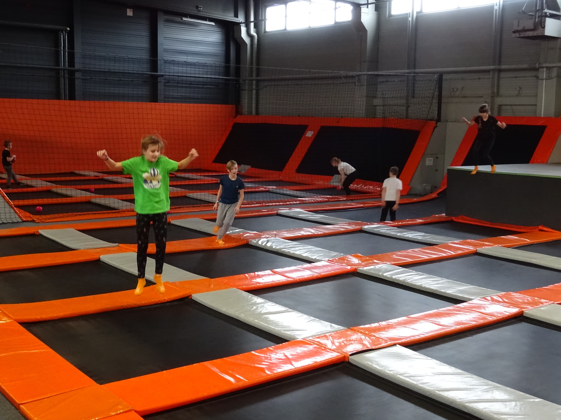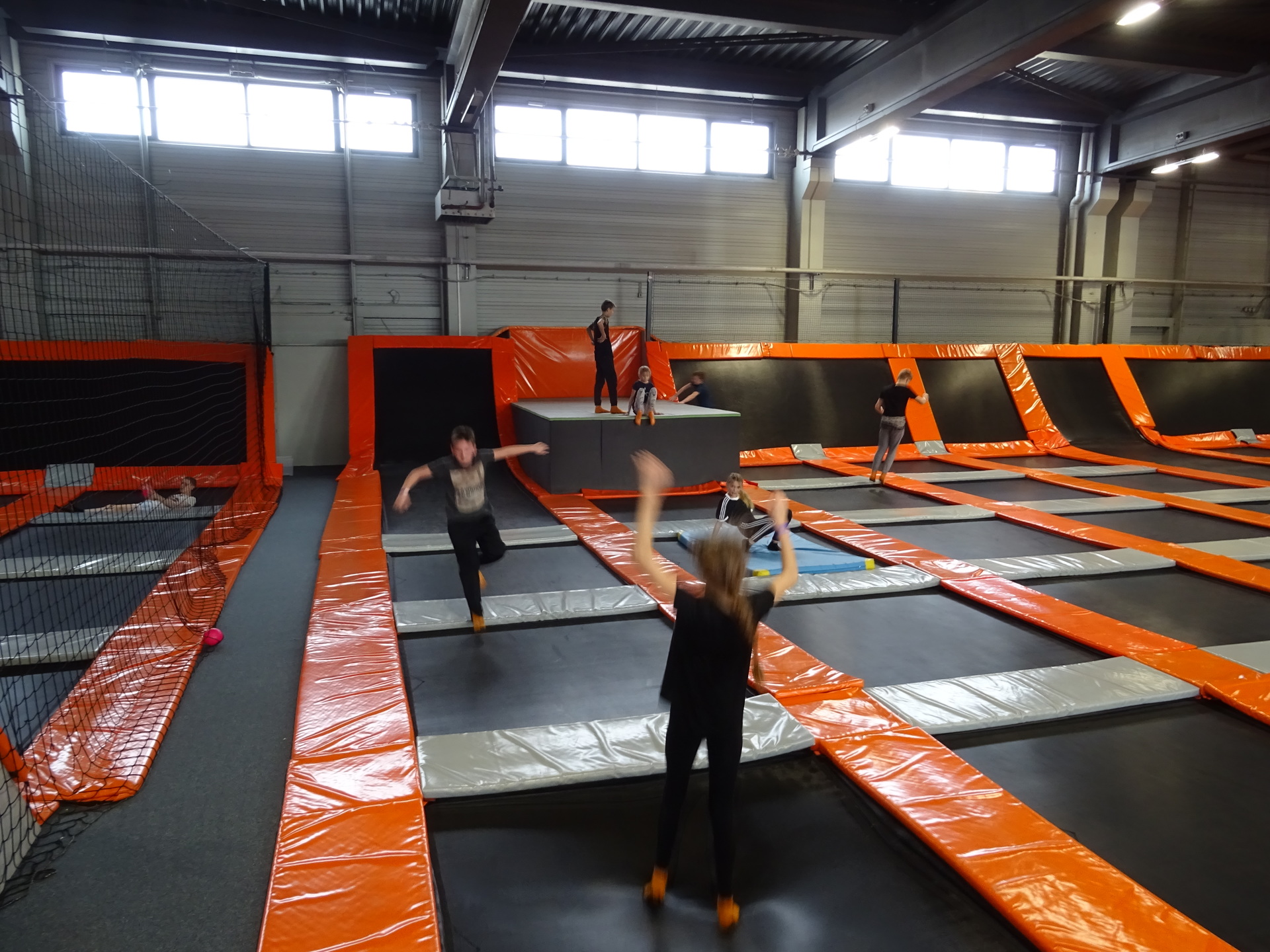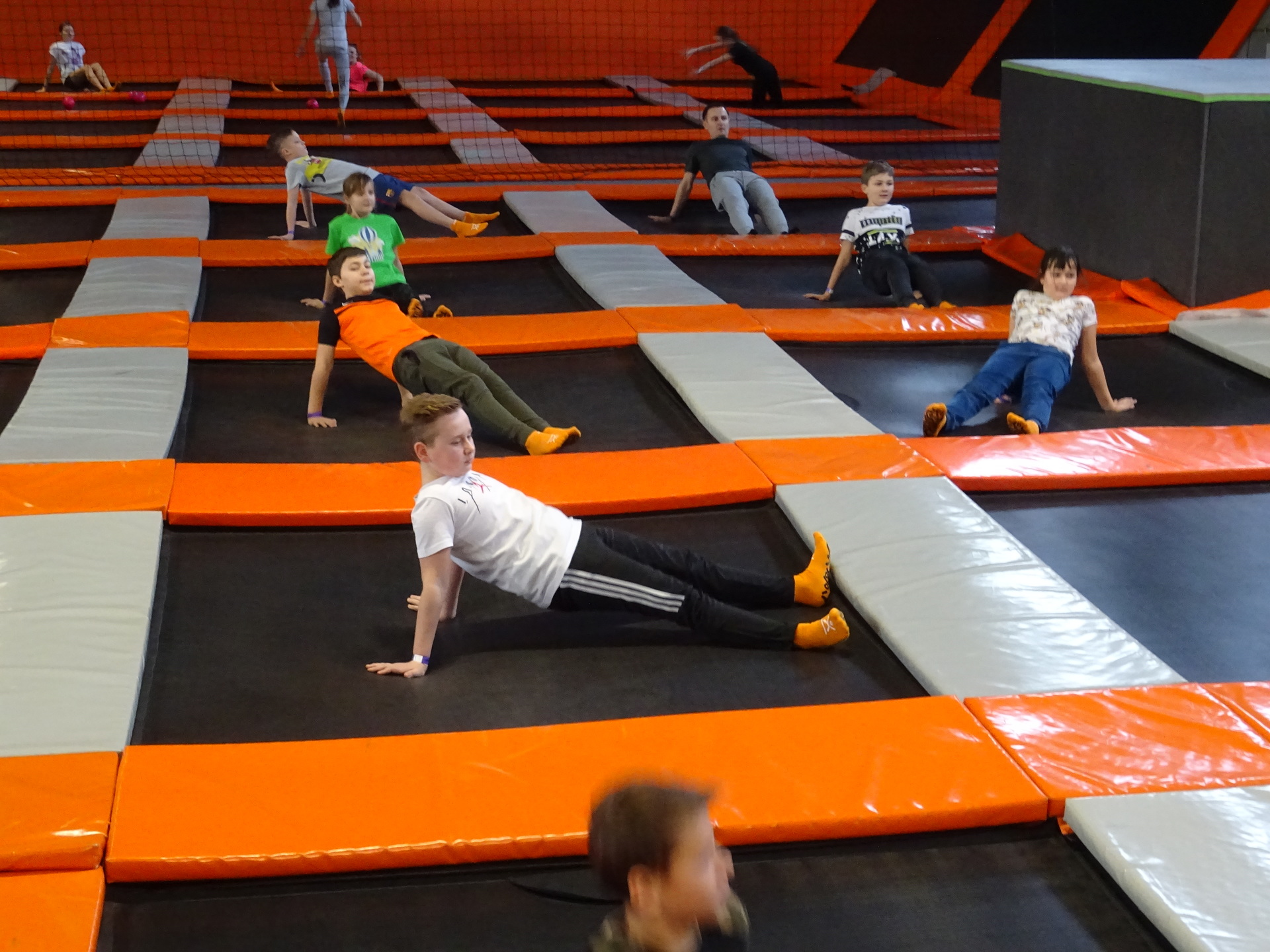 W parku trampolin po zapoznaniu się z zasadami bezpieczeństwa i kultury odbyła się wspólna rozgrzewka na trampolinach prowadzona przez trenera. Po niej każdy próbował swych sił na różnego rodzaju ścieżkach m.in. strefa gladiatorów, basen z gąbkami, trampolina sportowa, ścieżki akrobatyczne. Chętni próbowali swych sił na arenie do zbijaka.