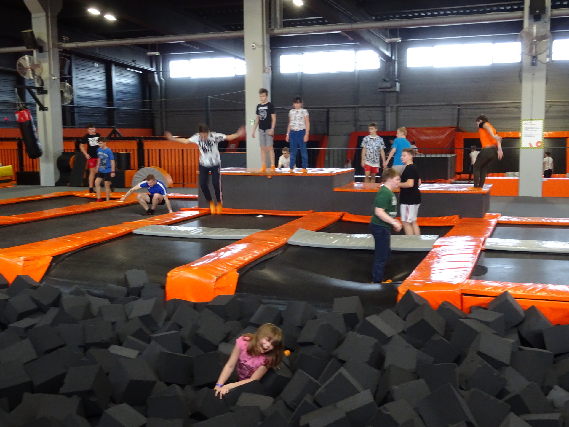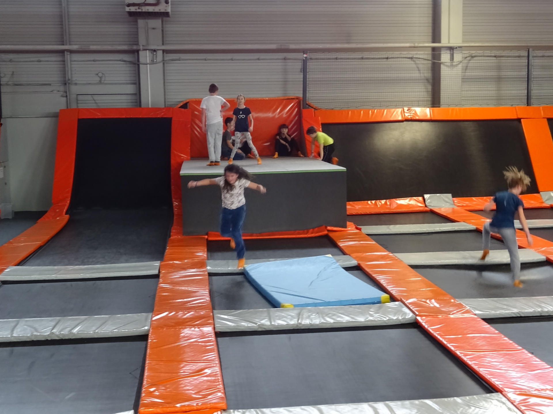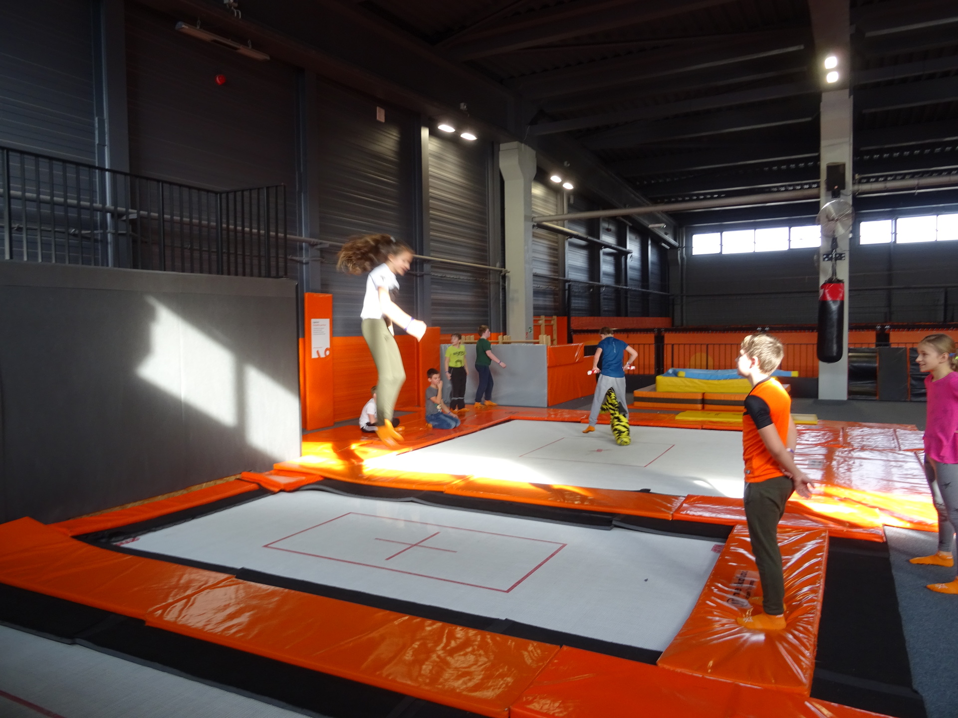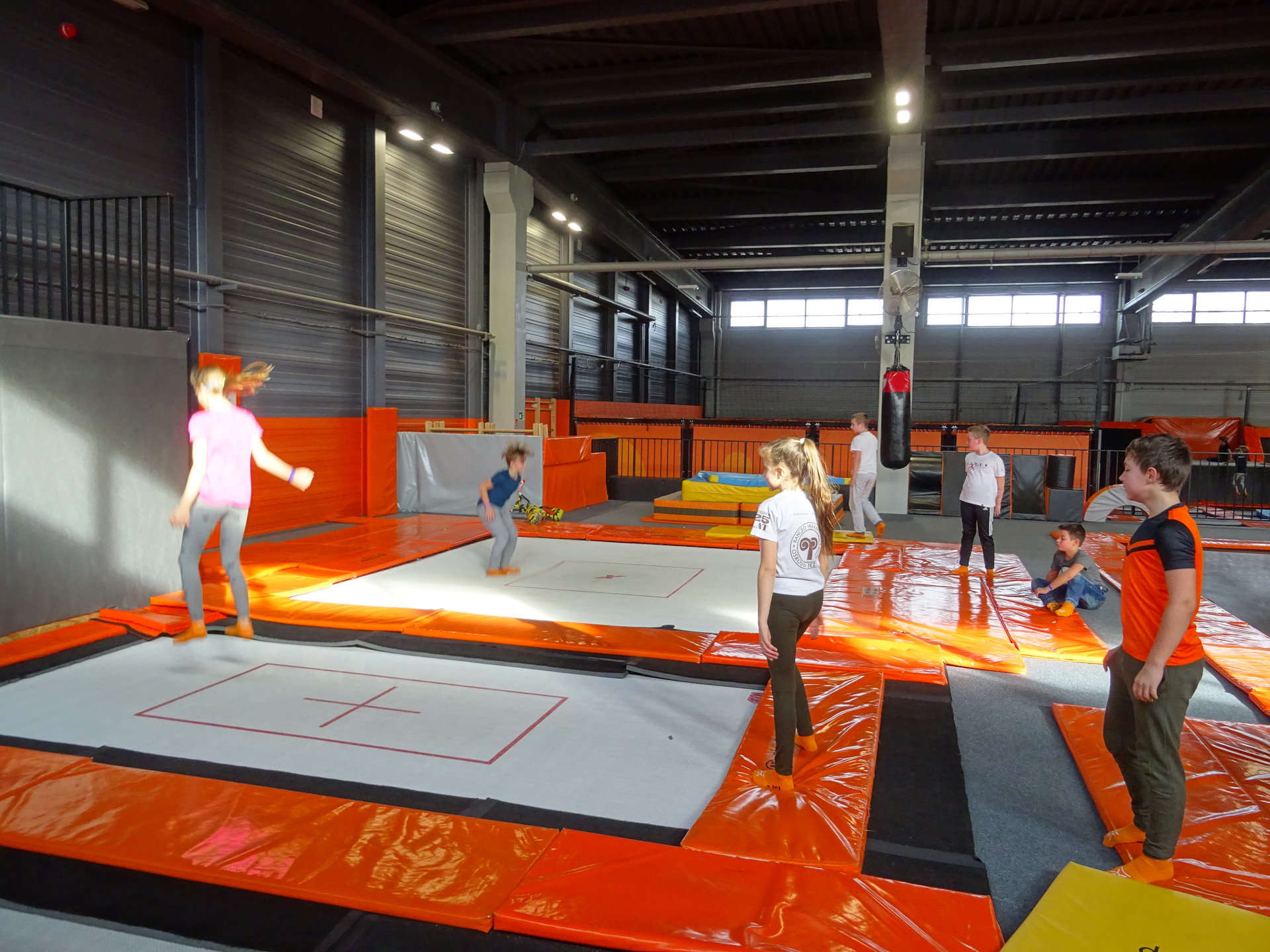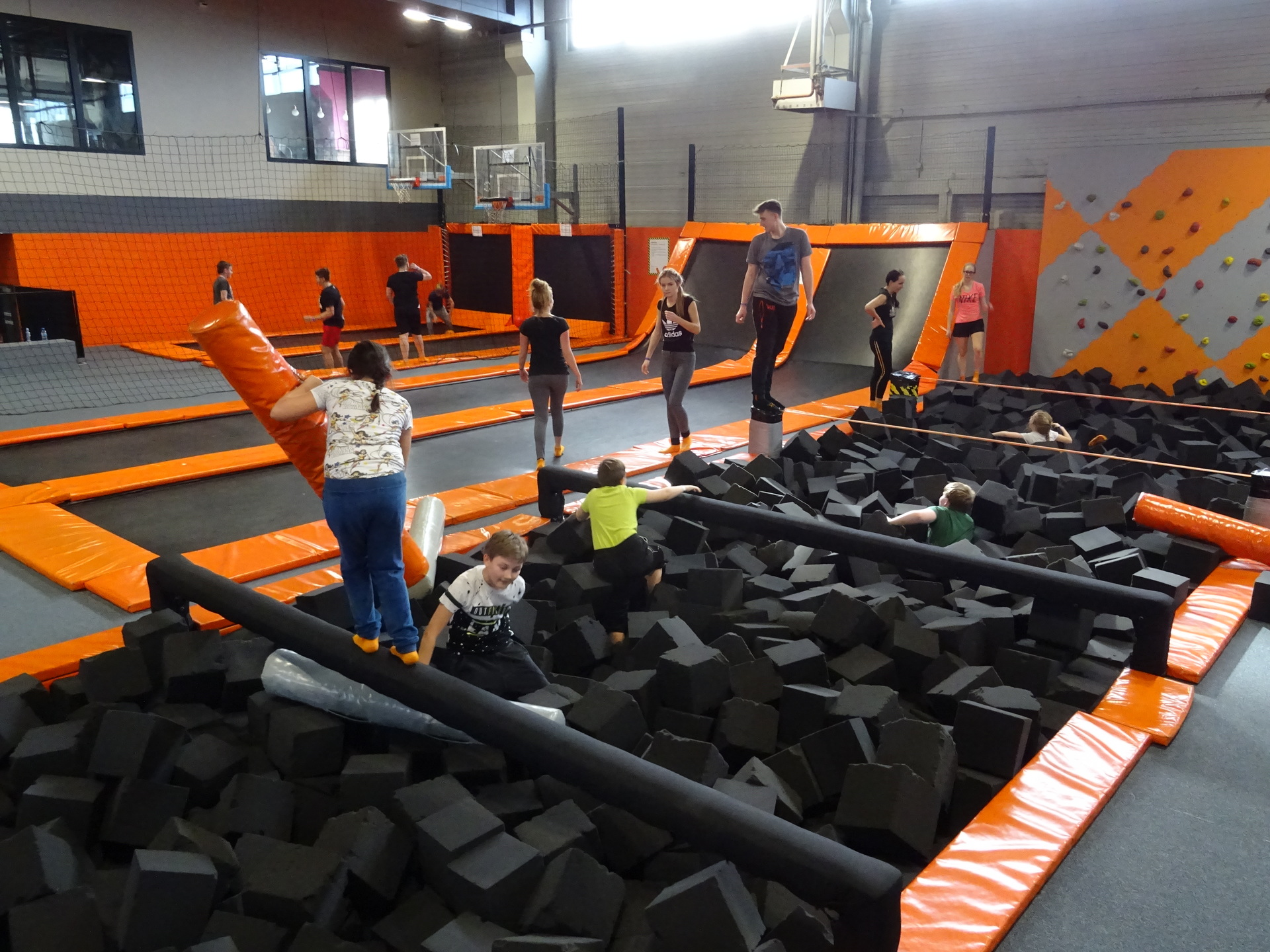 W parku trampolin po zapoznaniu się z zasadami bezpieczeństwa i kultury odbyła się wspólna rozgrzewka na trampolinach prowadzona przez trenera. Po niej każdy próbował swych sił na różnego rodzaju ścieżkach m.in. strefa gladiatorów, basen z gąbkami, trampolina sportowa, ścieżki akrobatyczne. Chętni próbowali swych sił na arenie do zbijaka.