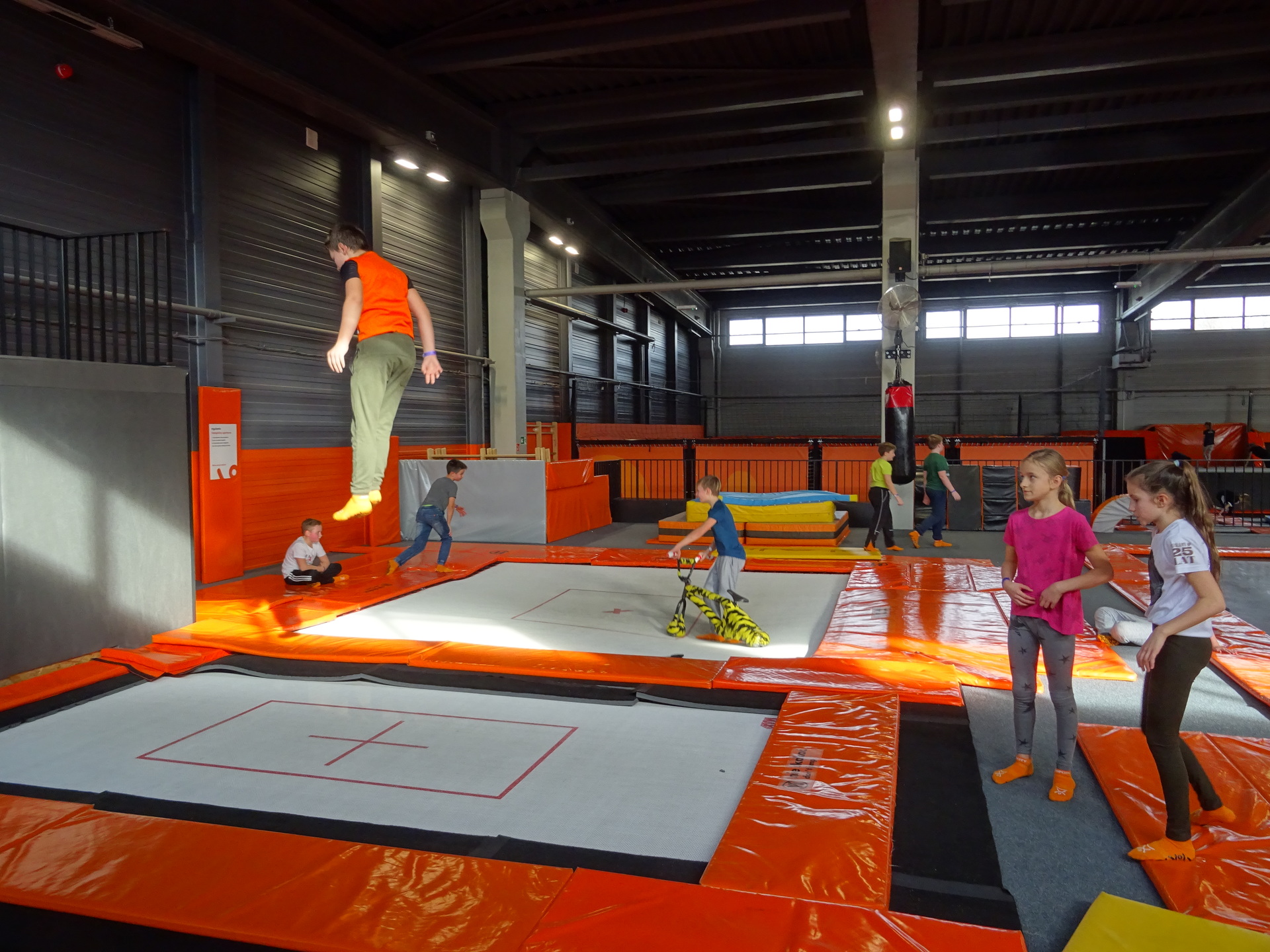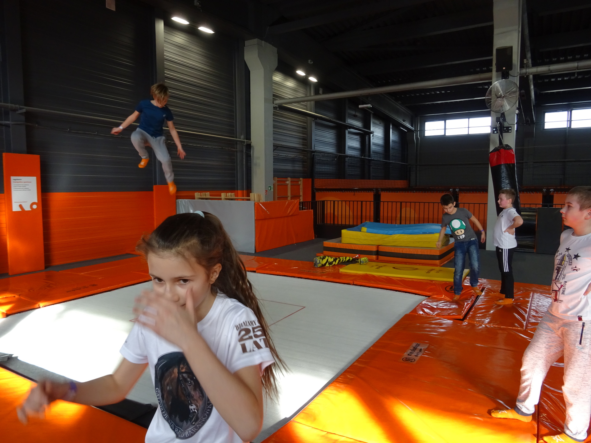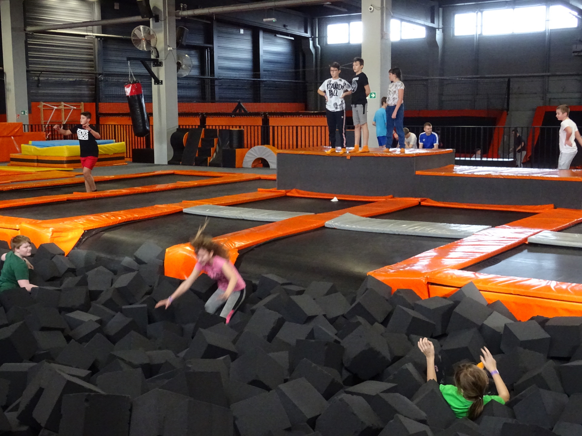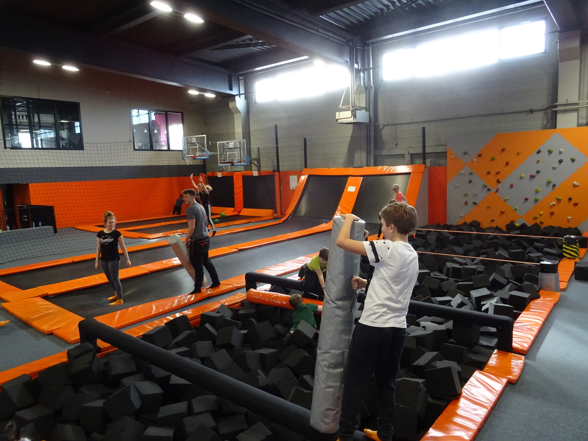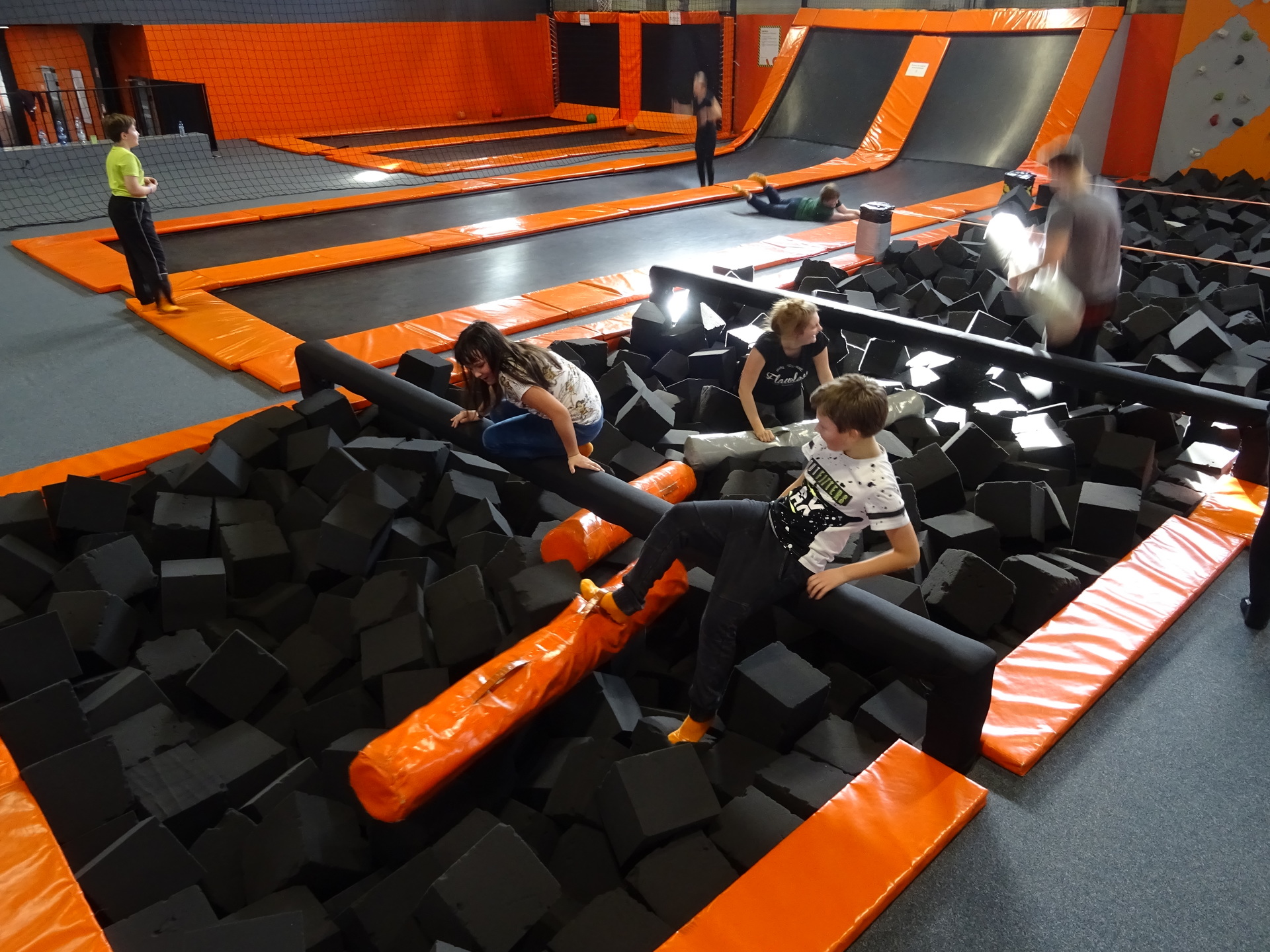 W parku trampolin po zapoznaniu się z zasadami bezpieczeństwa i kultury odbyła się wspólna rozgrzewka na trampolinach prowadzona przez trenera. Po niej każdy próbował swych sił na różnego rodzaju ścieżkach m.in. strefa gladiatorów, basen z gąbkami, trampolina sportowa, ścieżki akrobatyczne. Chętni próbowali swych sił na arenie do zbijaka.