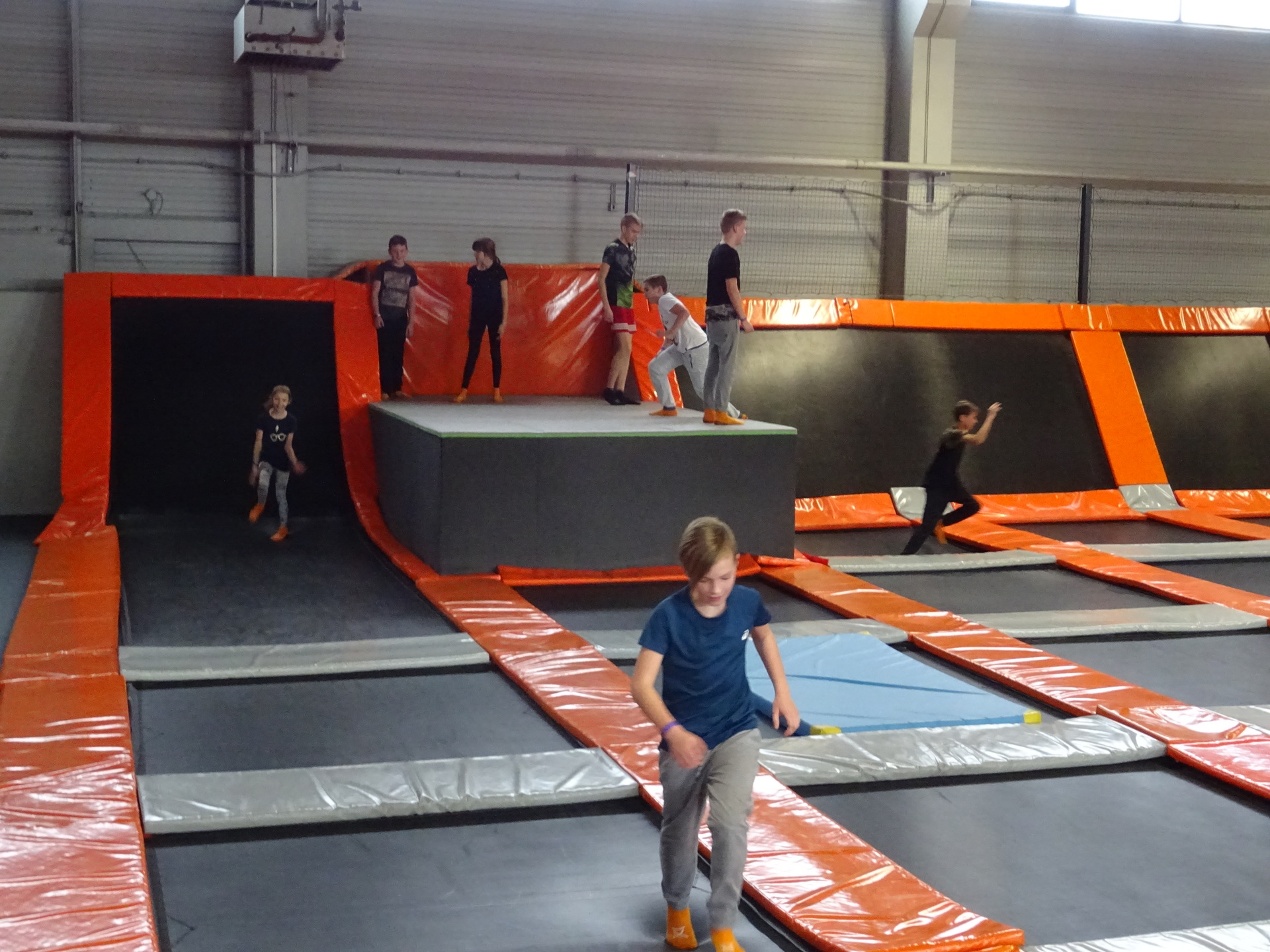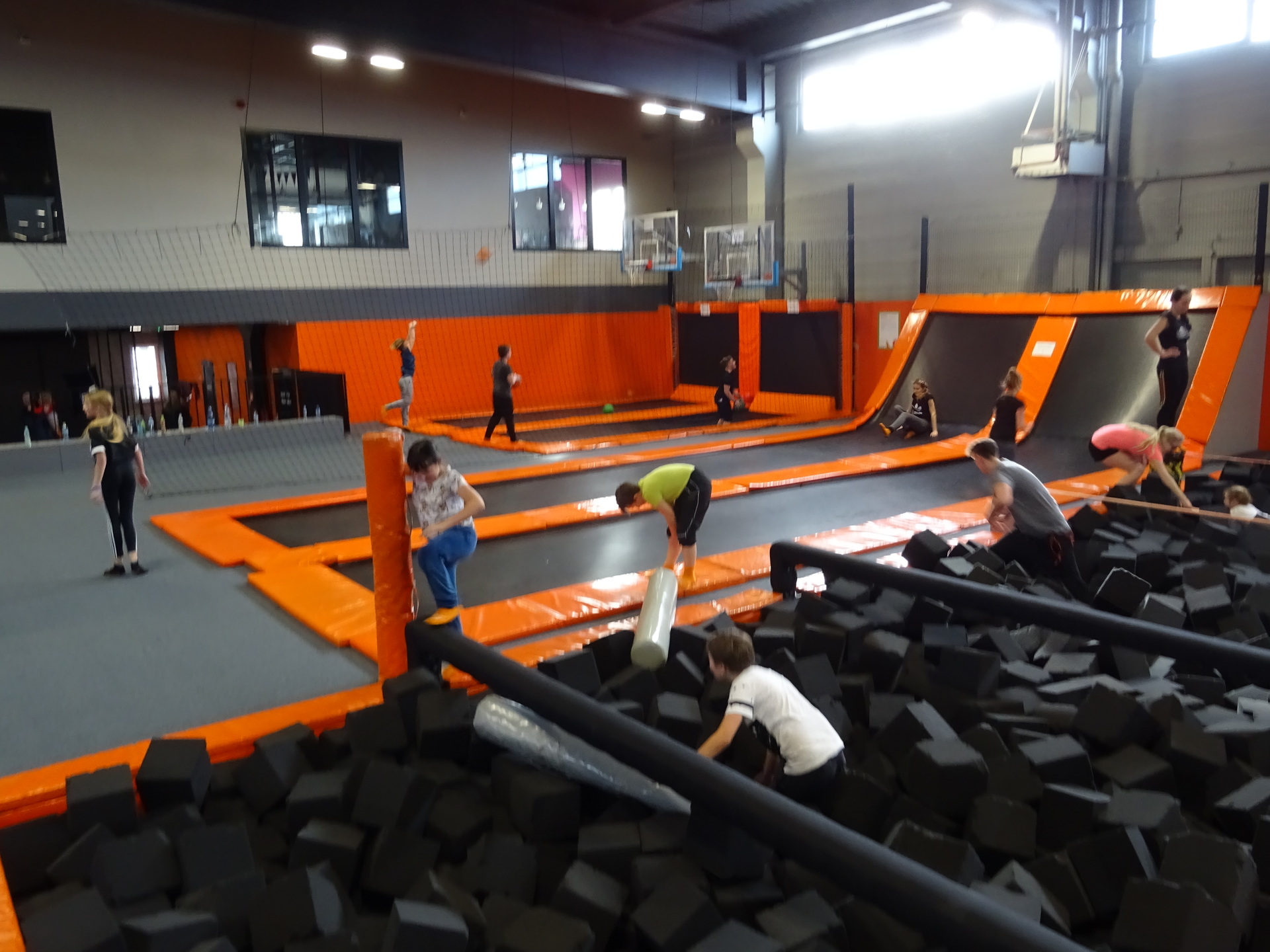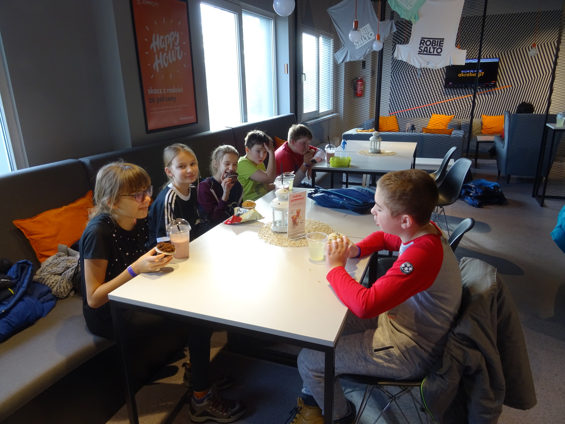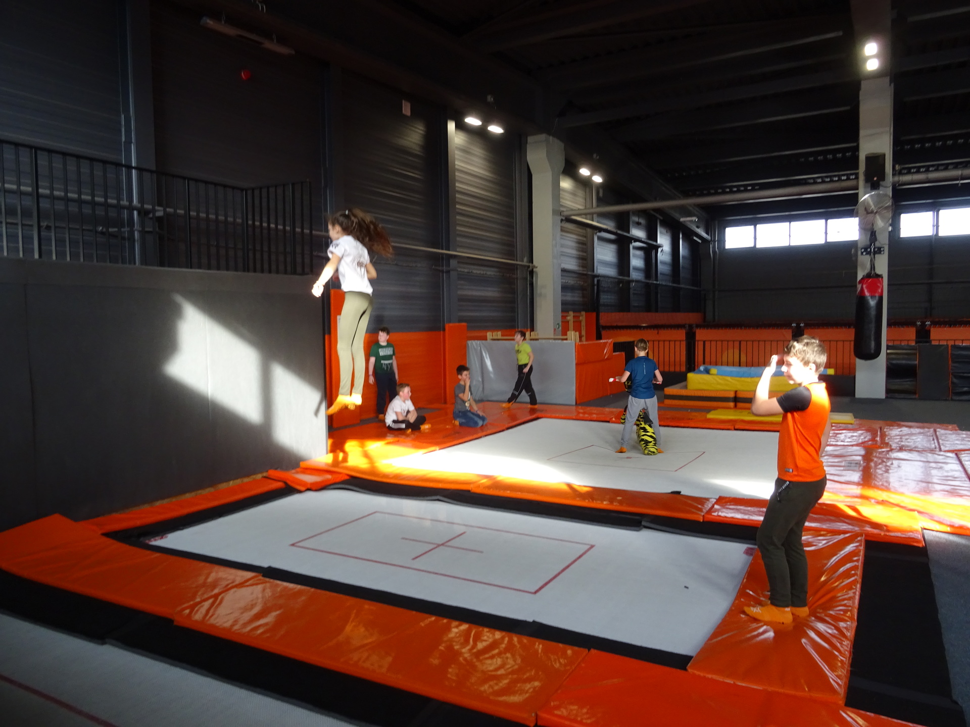 W parku trampolin po zapoznaniu się z zasadami bezpieczeństwa i kultury odbyła się wspólna rozgrzewka na trampolinach prowadzona przez trenera. Po niej każdy próbował swych sił na różnego rodzaju ścieżkach m.in. strefa gladiatorów, basen z gąbkami, trampolina sportowa, ścieżki akrobatyczne. Chętni próbowali swych sił na arenie do zbijaka.
