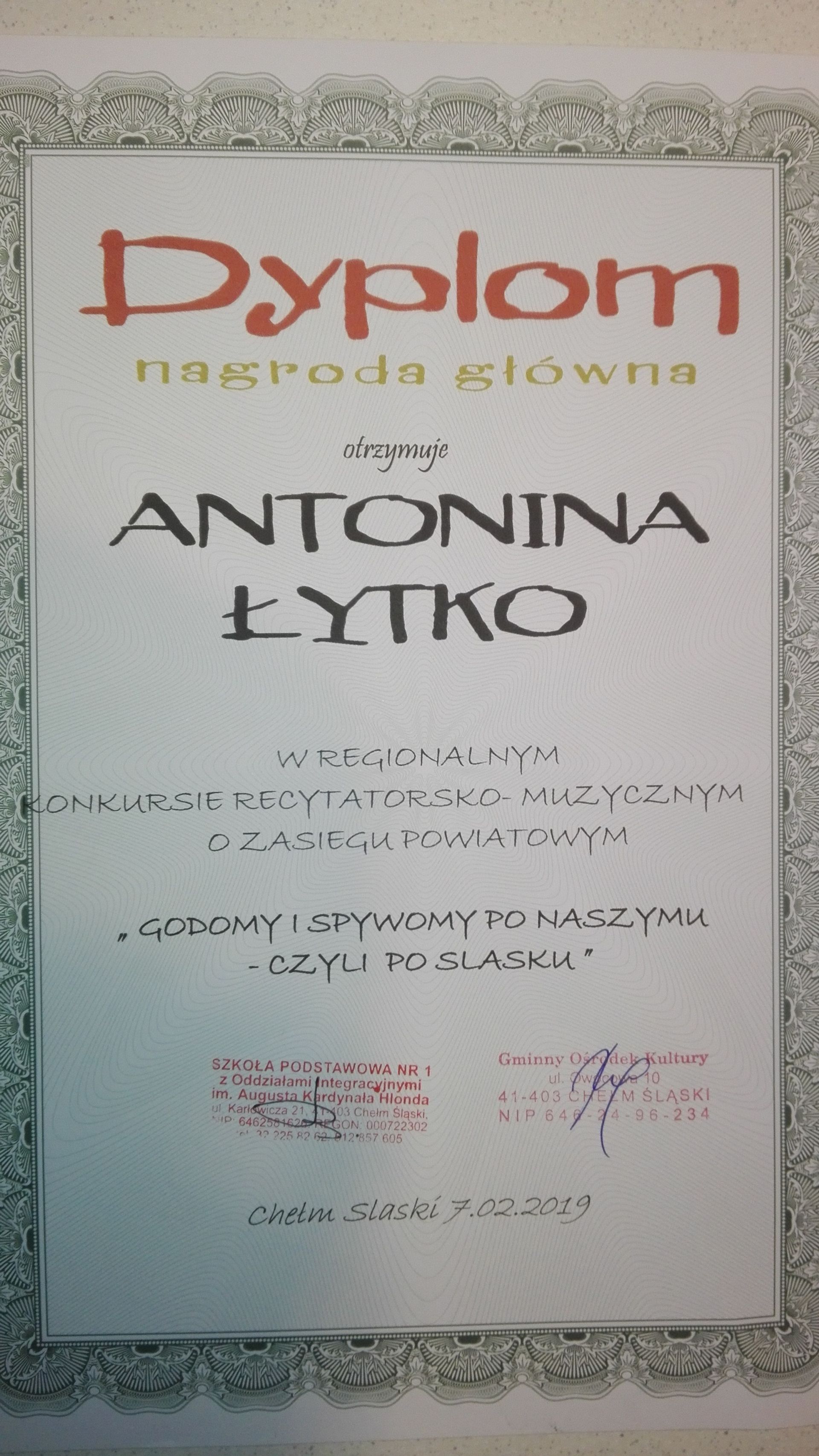 Antonina Łytko, uczennica klasy Id, zdobyła główną nagrodę w Regionalnym Konkursie Recytatorskim GODOMY I ŚPIYWOMY PO NASZYMU, CZYLI PO ŚLĄSKU w kategorii klas I- III. Konkurs zorganizowany przez Szkołę Podstawową nr 1 w Chełmie Śląskim we współpracy z Gminnym Ośrodkiem Kultury w Chełmie Śląskim odbył się 4 lutego.