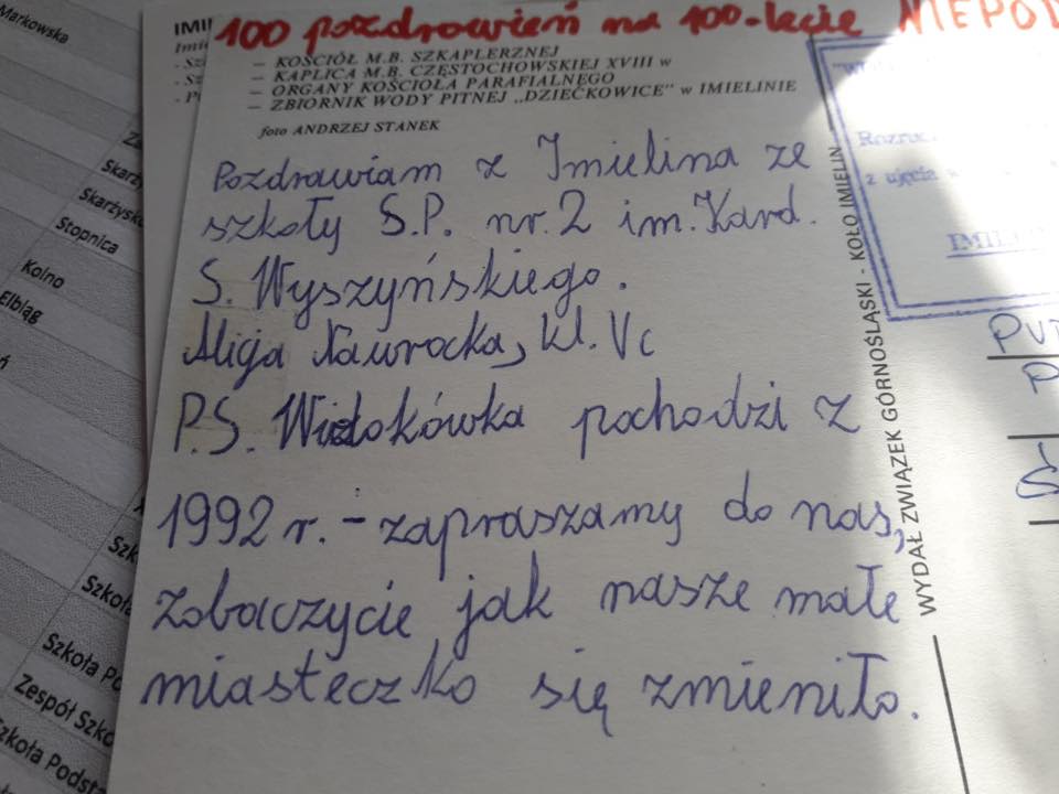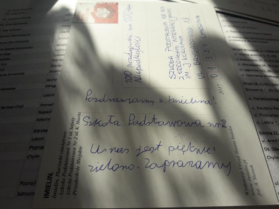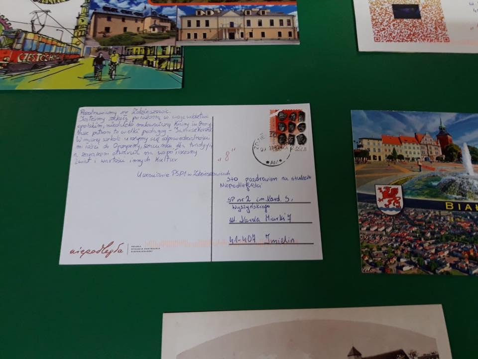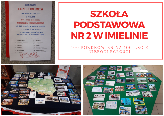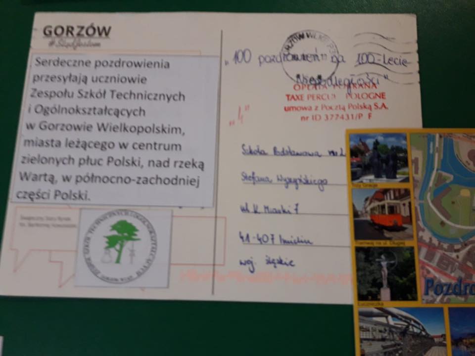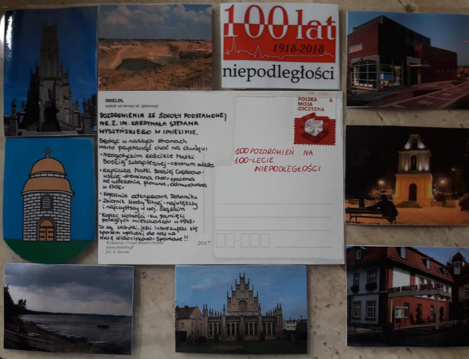 Nasza szkoła z okazji 100. rocznicy odzyskania przez Polskę Niepodległości włączyła się w akcję „100 pozdrowień na 100-lecie niepodległości” . Akcja ta objęła 600 szkół z całej Polski i powstała z inicjatywy nauczycieli, by świętować wspólnie tak wyjątkową rocznicę. Udział w tym przedsięwzięciu polegał na wysyłaniu przez uczniów szkół kartek z pozdrowieniami dla uczniów z innych miast. Dzięki temu mogli się poznać i poczuć wspólnotę mimo, że dzieli ich czasem setki kilometrów. Na kartkach znalazły się również ciekawe informacje o mieście, w którym znajduje się szkoła, dzięki nim możemy się dowiedzieć, dlaczego warto je odwiedzić. Wysyłając pozdrowienia, promowaliśmy również nasz Imielin, dumni z tego, jak dużo w naszym miasteczku zmieniło się w ostatnich latach. Czytanie kartek, podziwianie okolic przedstawionych na pocztówkach, sprawiło nam dużo radości i było szczególnym elementem obchodów tego ważnego dla każdego Polaka wydarzenia. Akacja pisania i zbierania pocztówek trwała cały październik i została zwieńczona wystawą, którą można podziwiać na korytarzu naszej szkoły- zachęcamy wszystkich do czytania pozdrowień !