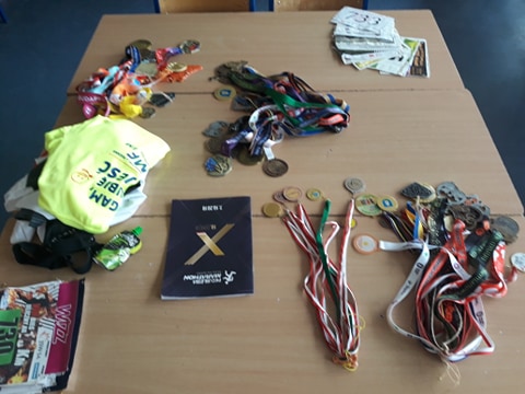 pliki numerów startowych i pęki medali zdobyte przez rodziców i