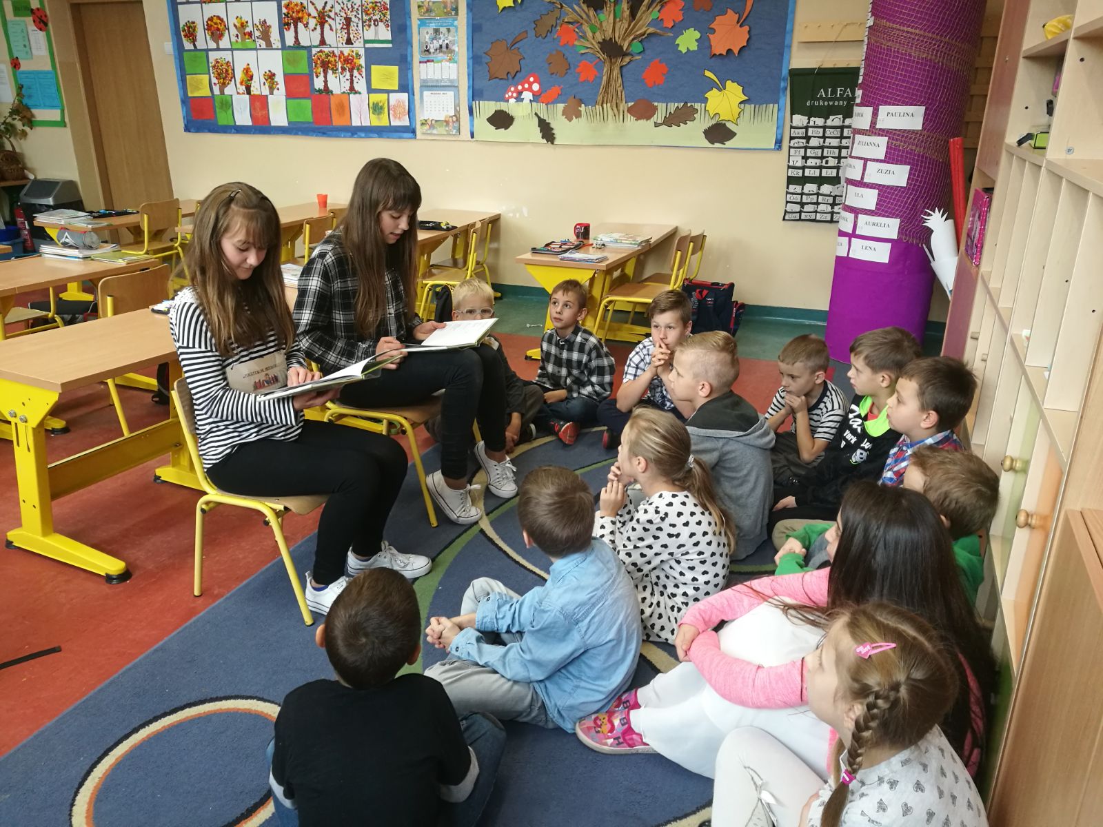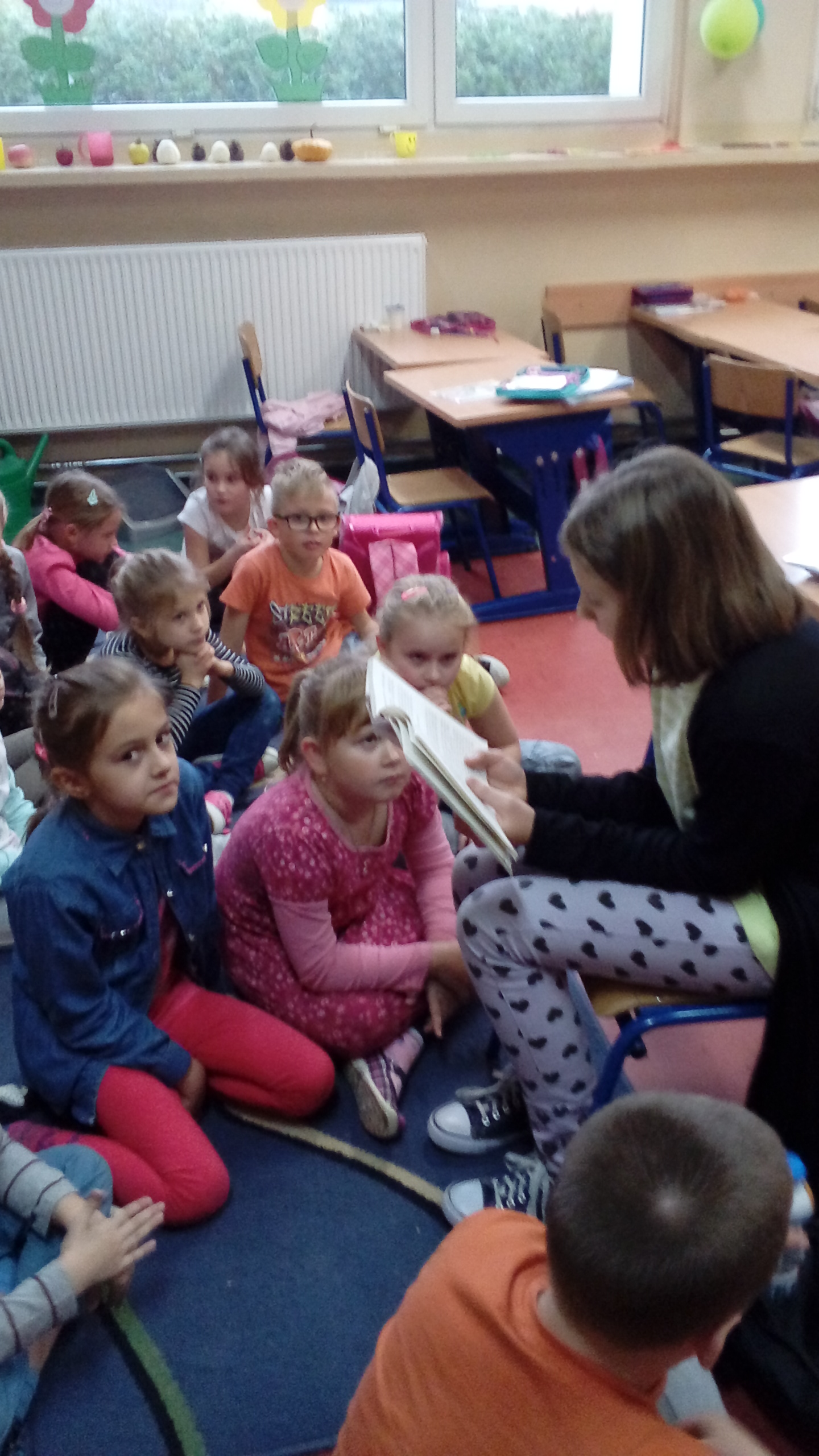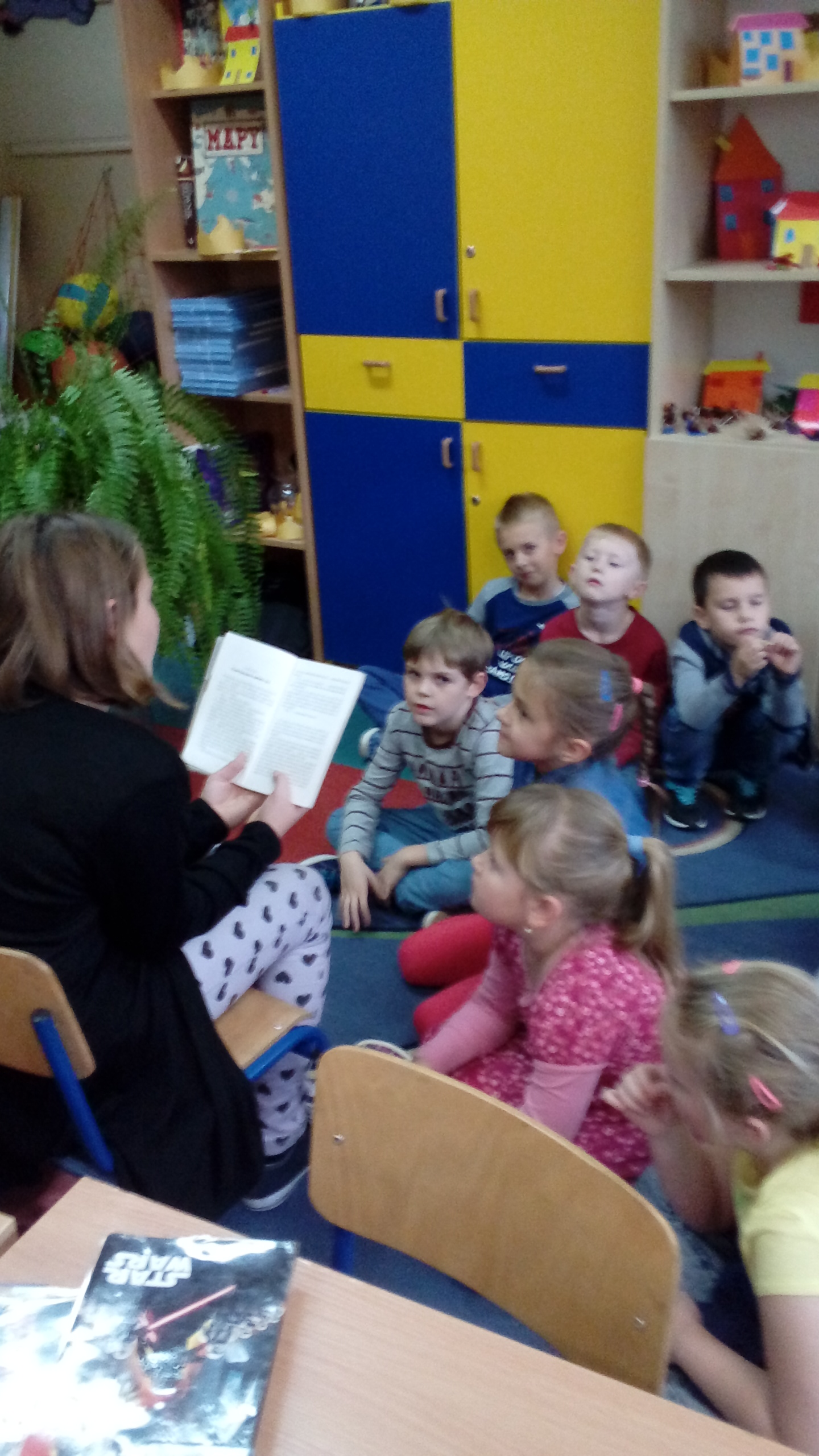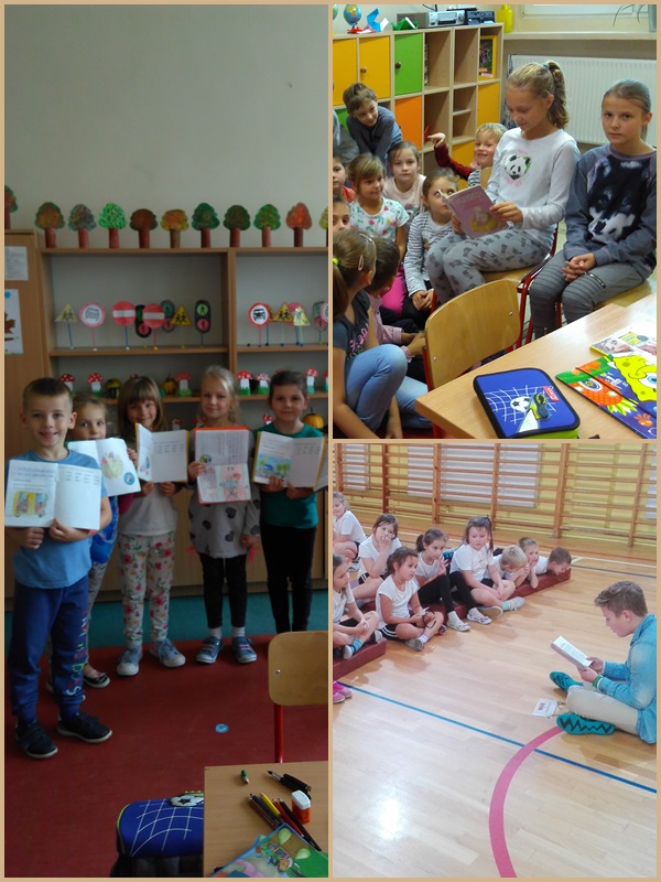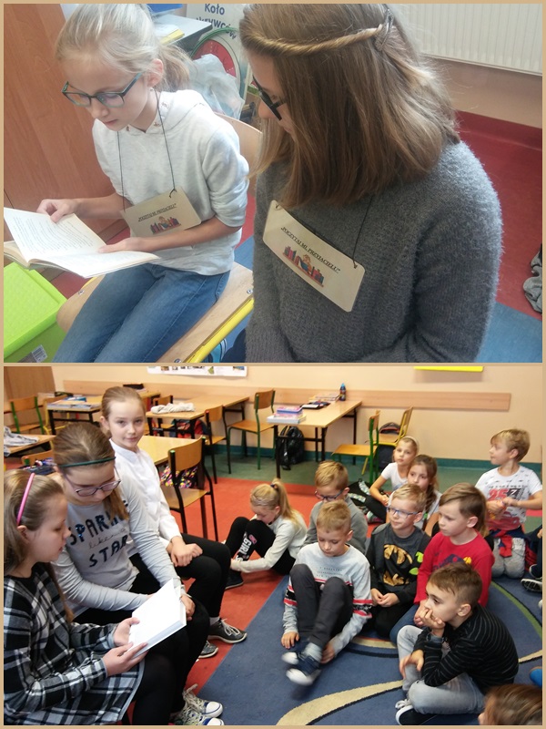 Uczniowie klas szóstych czytali w klasach młodszych I-III i na świetlicy. Dzieci z chęcią słuchały o przygodach bohaterów książkowych, rozwijając swoje zainteresowania czytelnicze, swoją wyobraźnię, bogacąc słownictwo oraz integrując się ze starszymi kolegami i koleżankami.