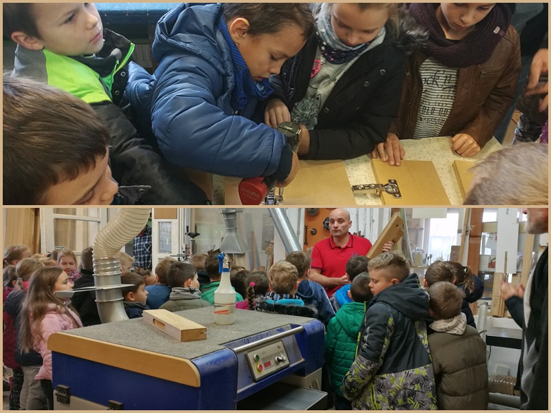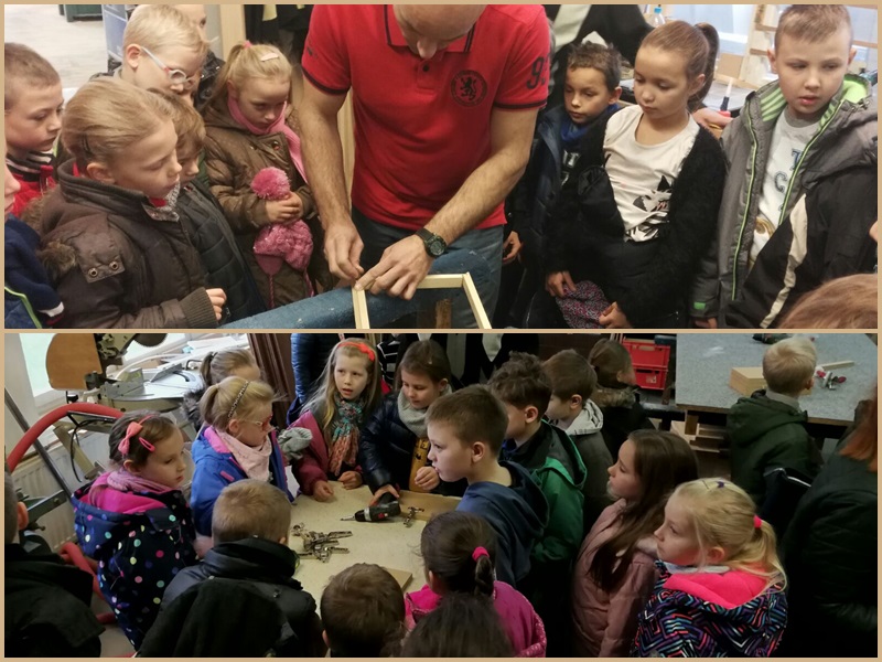 Właściciel zakładu - pan Józef ciekawie opowiadał nam, jak działają poszczególne maszyny stolarskie. Stolarz Mirek zademonstrował na drewnianym elemencie poszczególne czynności, jakie należy wykonać na maszynach, aby powstał element, który można wykorzystać w dalszej produkcji drzwi. Następnie pan Tomek uczył nas, jak szybko za pomocą maszyny można zrobić ramkę na zdjęcia lub obraz. Każdy uczestnik wycieczki pod kontrolą stolarza - pana Mariusza, samodzielnie mógł wywiercić otwory pod zawiasy meblowe. Pod okiem fachowca przykręcaliśmy wkrętarką zawiasy do wcześniej wywierconych otworów w płycie meblowej, co sprawiło nam wielką frajdę! Na zakończenie zwiedzania czekała na nas słodka niespodzianka.