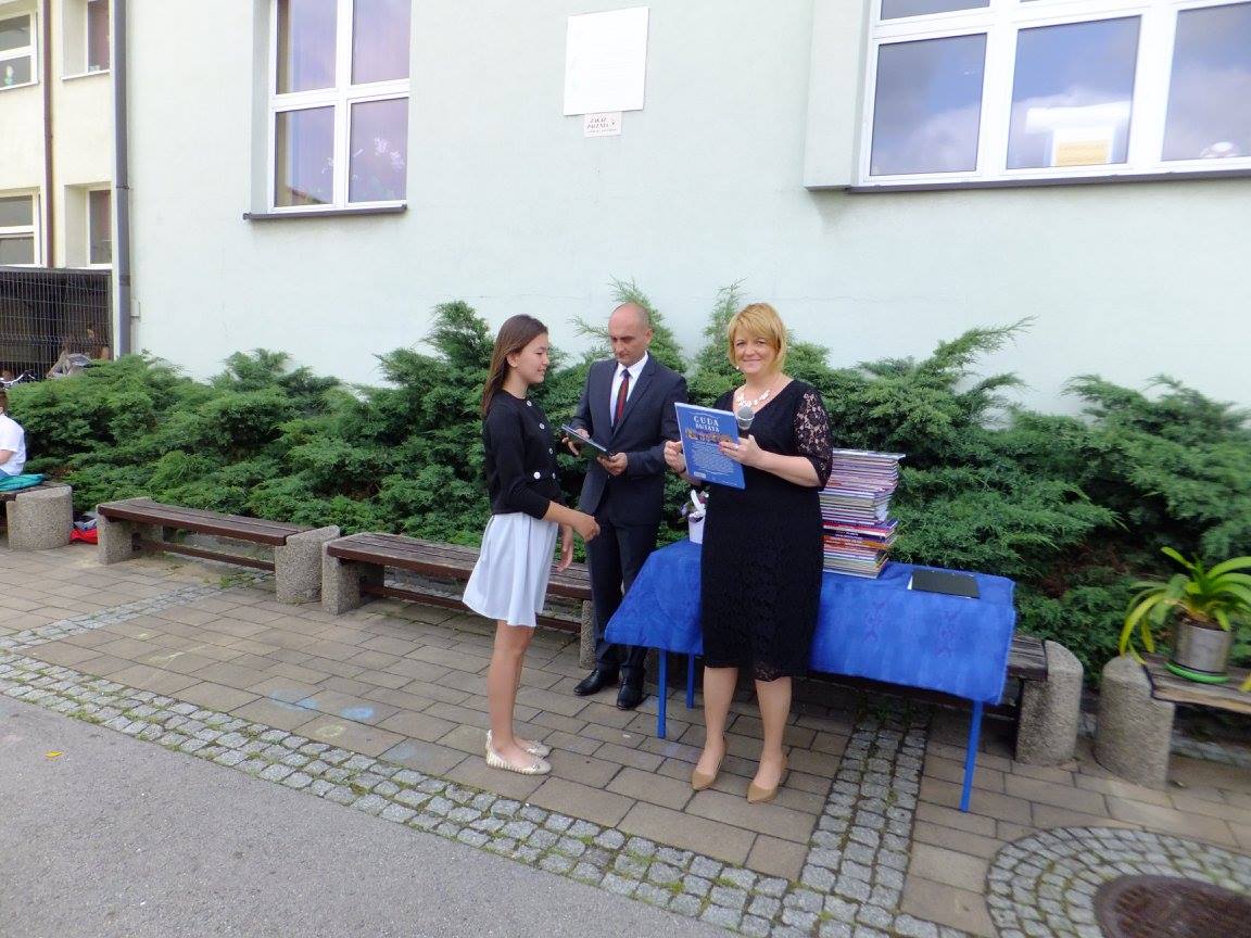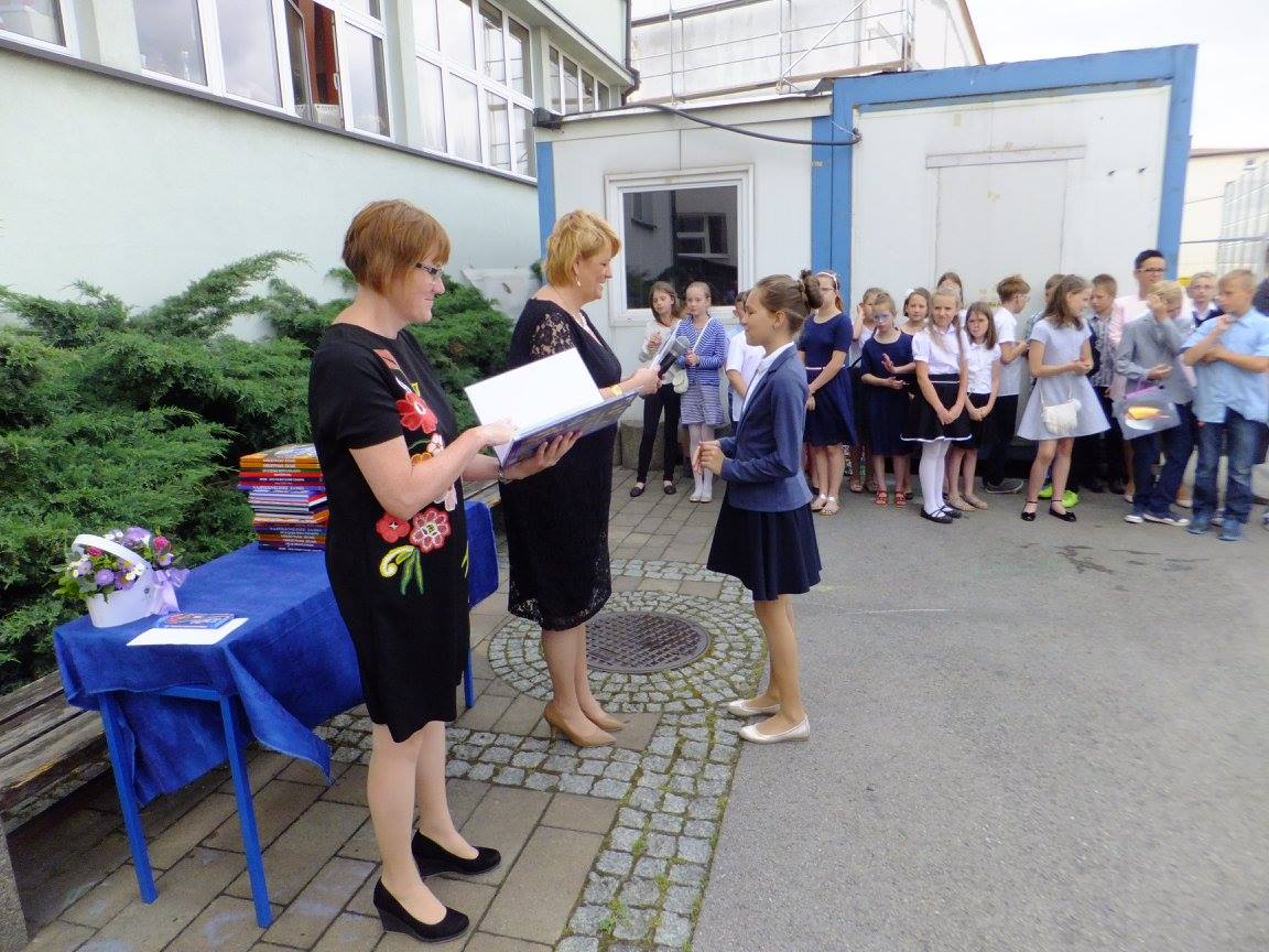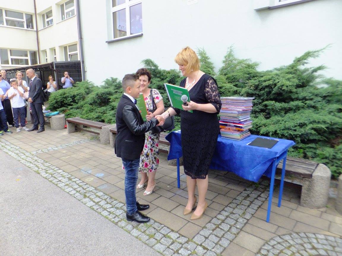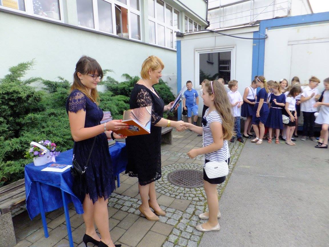 Uroczystość zakończenia roku szkolnego 2016/2017 w naszej szkole tradycyjnie rozpoczęła się o 08:00 Mszą św. w parafialnym kościele. Wręczenie świadectw odbyło się na boisku szkolnym, w dwóch turach: klasy I-III o 09:15, klasy IV-VI o 09:45.