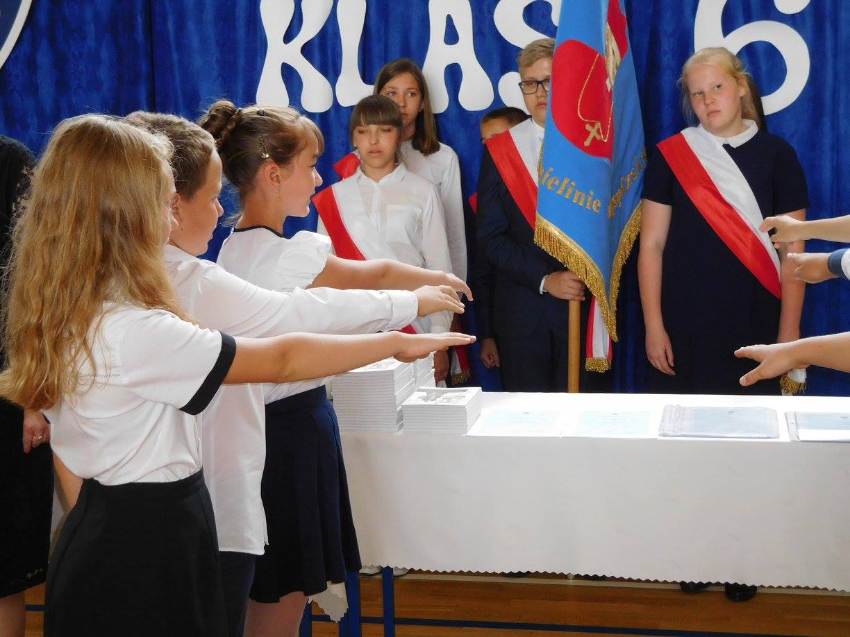 Klasy VI, które w tym roku żegnają się z murami naszej szkoły, nie żegnając się jednak z podstawówką, świętowały nieco bardziej uroczyście. O godzinie 10:30 w sali gimnastycznej rozpoczęła się akademia pożegnalna, na którą przybyli przedstawiciele Urzędu Miasta Imielin z panem burmistrzem na czele, rodzice i nauczyciele. Po ceremonii zaprzysiężenia nowego pocztu sztandarowego wręczone zostały świadectwa dla najlepszych uczennic i uczniów z klas VI: a, b, c i d. Wyróżniający się uczniowie otrzymali również nagrody specjalne - za szczególne osiągnięcia m.in. w nauce, sporcie, sztuce, działaniach wolontariacie. Za pracę na rzecz szkoły podziękowania otrzymali rodzice z tzw. "trójek" klasowych.