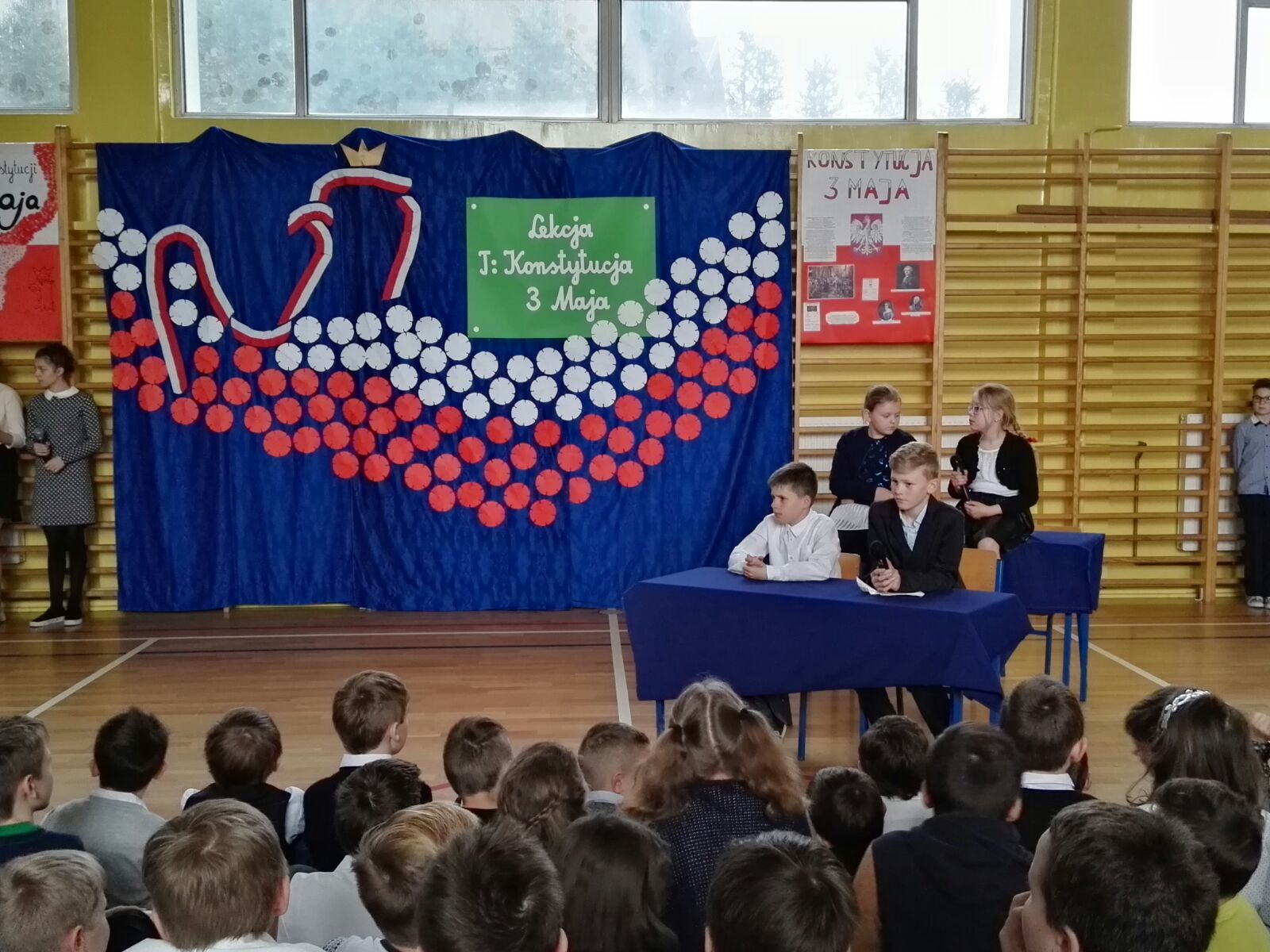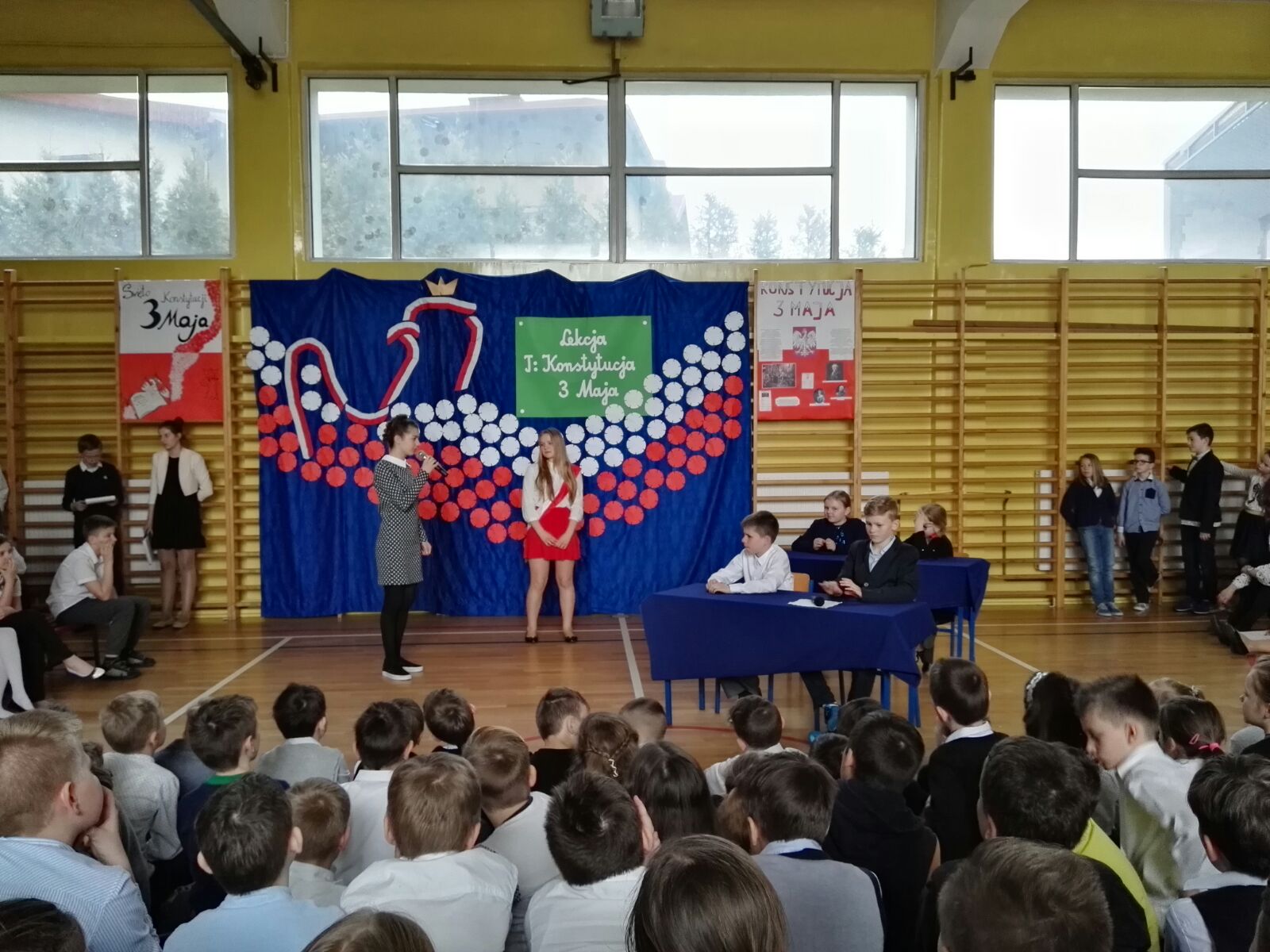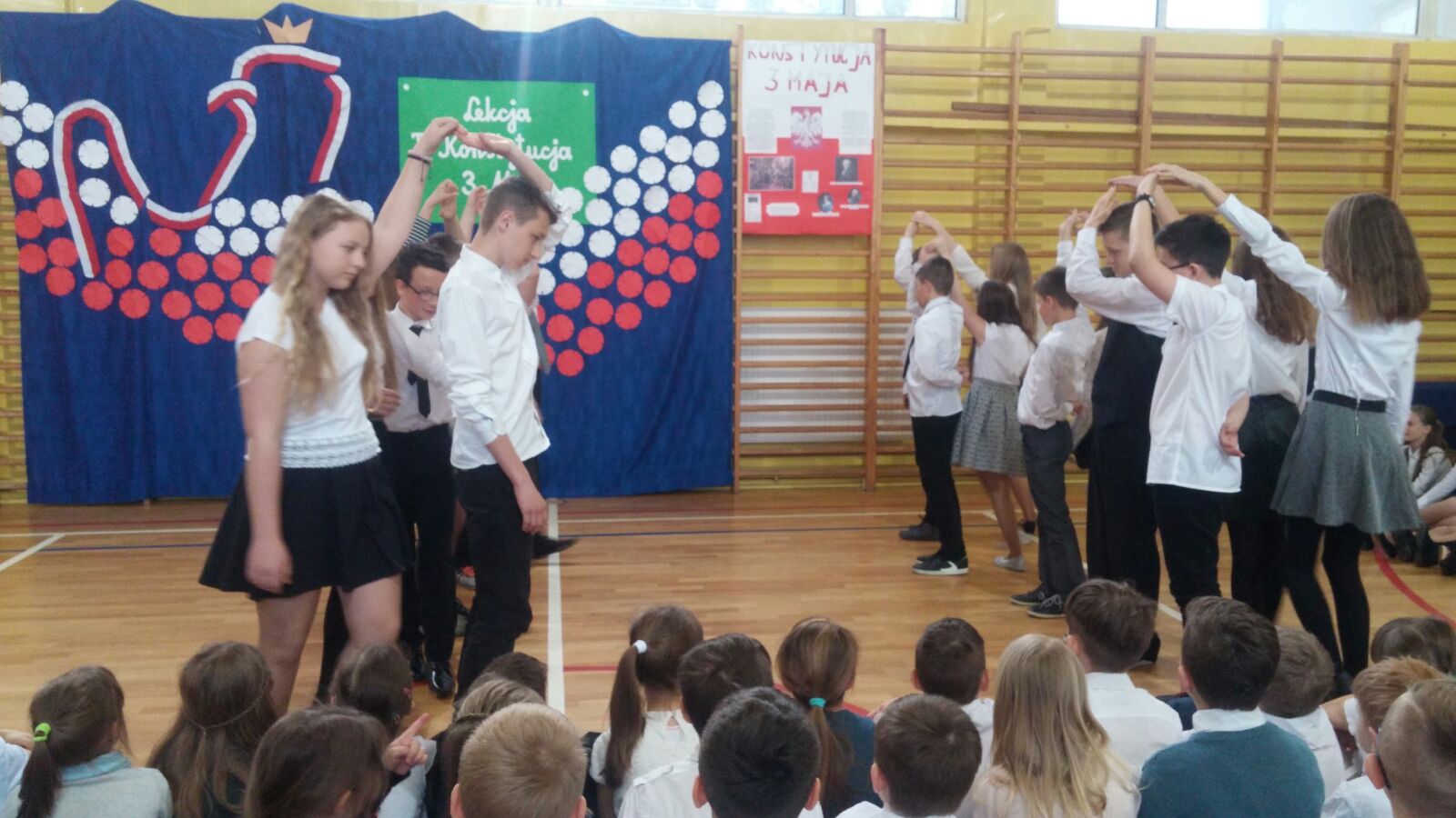 Następnie dzieci miały okazję oglądać scenkę, która była świetną lekcją historii. Podczas przedstawienia, można było się dowiedzieć, co to jest właściwie konstytucja, dlaczego Konstytucja 3 Maja była tak ważna dla Polski oraz że obchodzimy już 226 rocznicę jej uchwalenia. Uczniowie występujący podkreślali również fakt, że była to druga na świecie i pierwsza w Europie konstytucja.