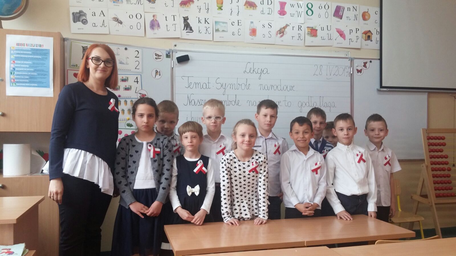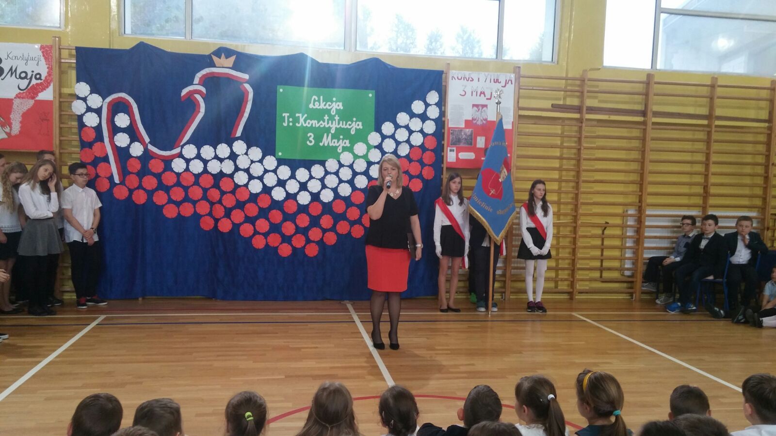 Akademię rozpoczęła Pani Dyrektor Dagmara Kupczyk, która wprowadziła uczniów w tematykę apelu, przypominając o zbliżającym się Święcie Pracy, Święcie Flagi i Święcie Konstytucji. Dzieci dowiedziały się o znaczeniu flagi państwowej oraz symbolice kolorów flagi Polski. Następnie odbyła się część artystyczna apelu, którą przygotowali uczniowie klasy IV "d" oraz VI "c" pod kierunkiem Pani Joanny Rogalskiej oraz Pana Bartosza Stachonia. W rolę prowadzących wcielili się natomiast uczniowie klasy VI "a".
