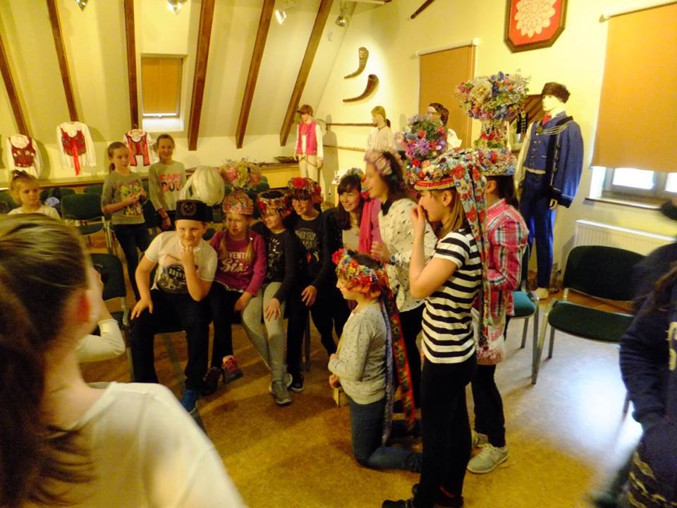 Po przerwie (na konsumpcję przywiezionych ze sobą smakołyków) uczennice i uczniowie uczestniczyli w lekcji poświęconej folklorowi Górnego Śląska. Mieli okazję zobaczyć dawne stroje z różnych regionów Śląska, mogli przymierzać wianki czy kapelusze. Dowiedzieli się, że każdy element stroju – dziewczyny, młodzieńca, mężatki czy męża – miał określone znaczenie. Na przykład kolor „szlajfek” przy wianku dziewczyny, ilość guzików przy męskim surducie, czy to, że panna młoda nie miała białej sukni tylko czarną, którą po ślubie przez lata nosiła.